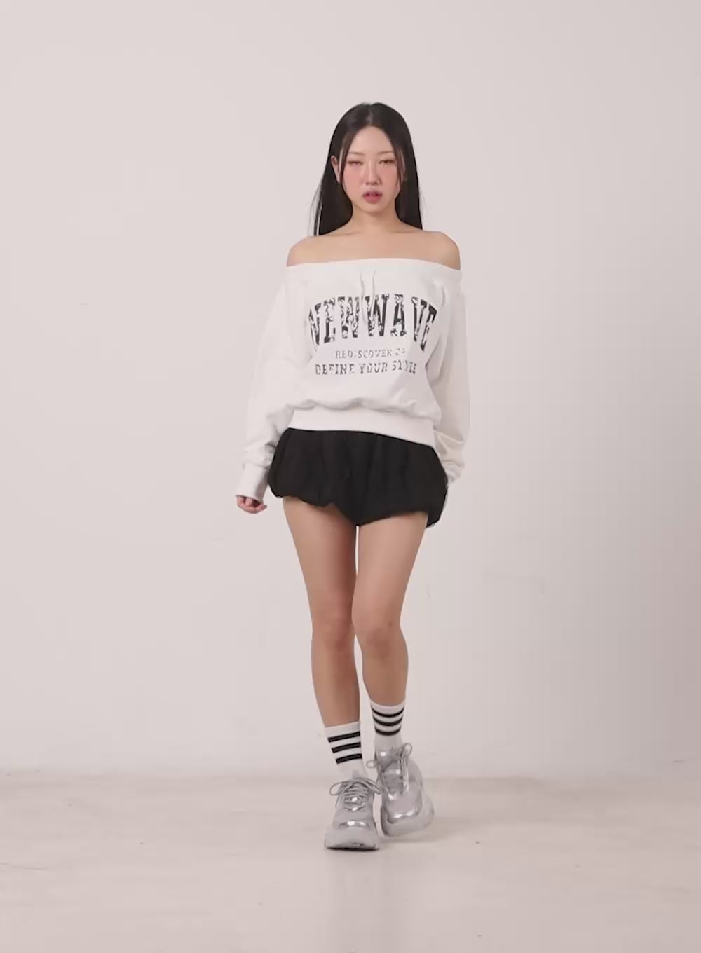Snow white off-shoulder sweater radiates delicate charm with its ribbon accents, giving a subtle nod to coquette styling.