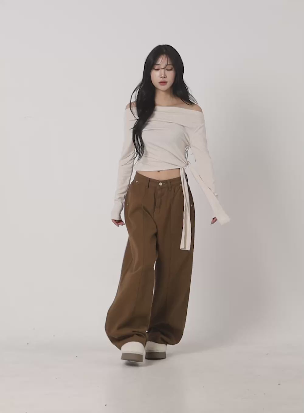 ribbon-boat-neck-long-sleeve-crop-top-cj501 / Light beige
