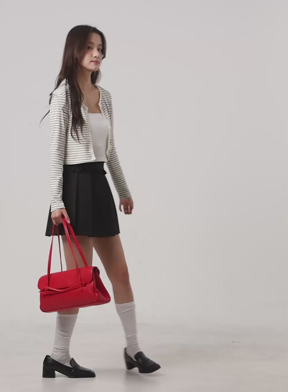 If you’re all about that soft, feminine vibe, this look is so you. A cropped red cardigan with a flirty polka-dot mini skirt? Adorbs! It’s perfect for snapping cute pics with your besties or just feeling cute while exchanging Galentine’s gifts. Throw in a bouquet of roses (for yourself, obviously), and you’re set for a day full of love, laughs, and unforgettable memories.