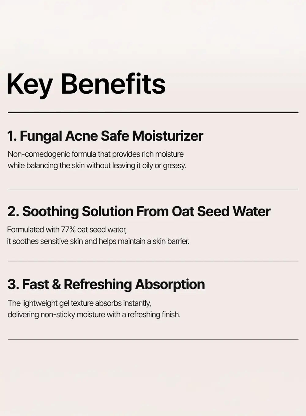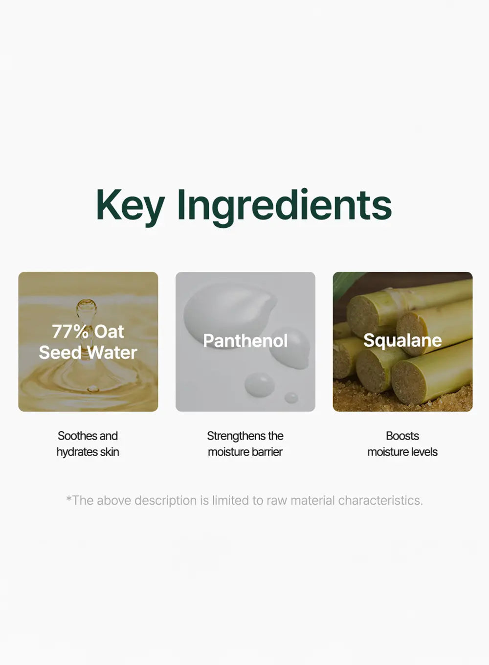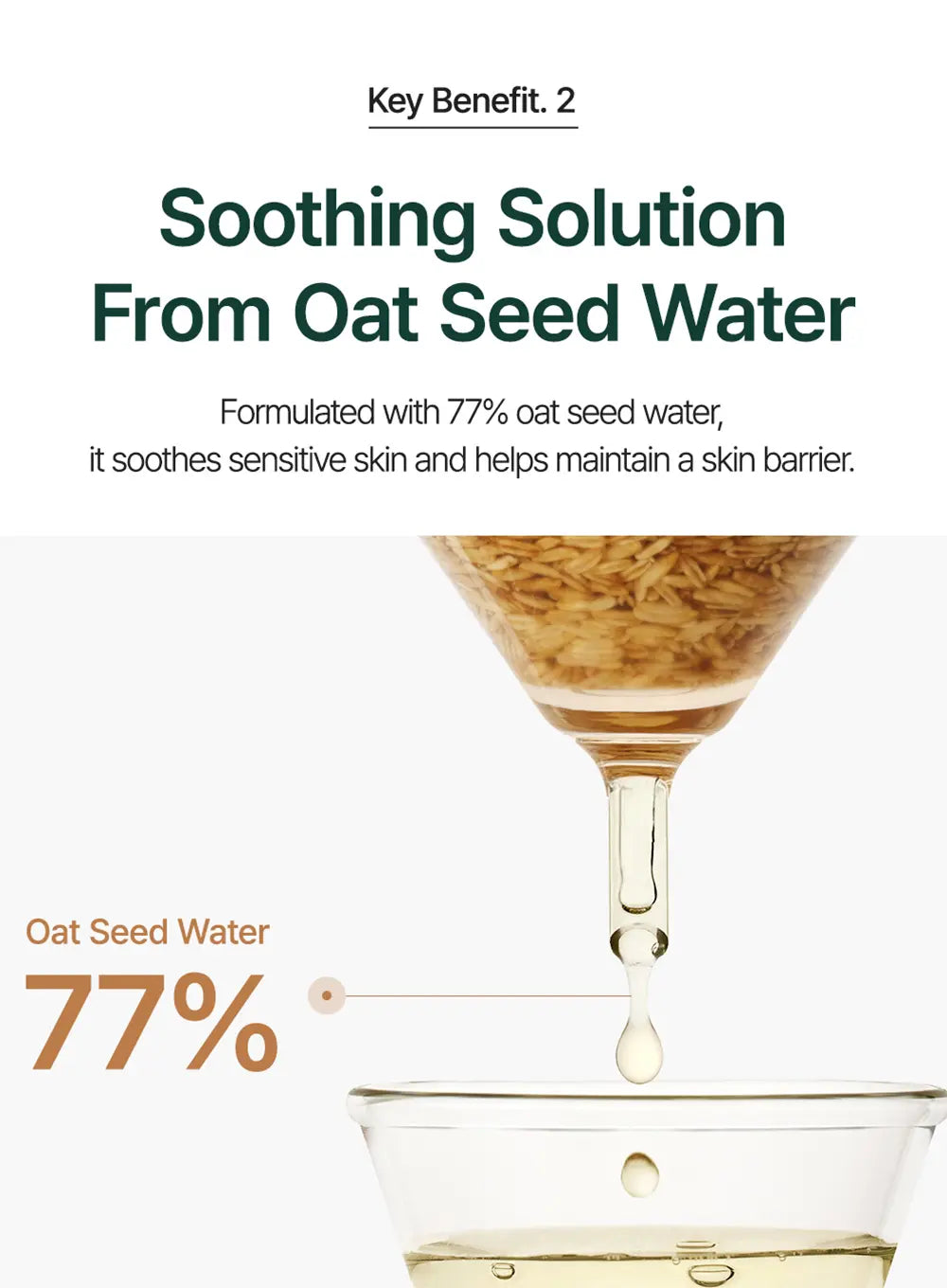 - Contains 77% Oat Seed Water, renowned for its soothing and moisture-enhancing properties, instantly improving the skin's moisture barrier.