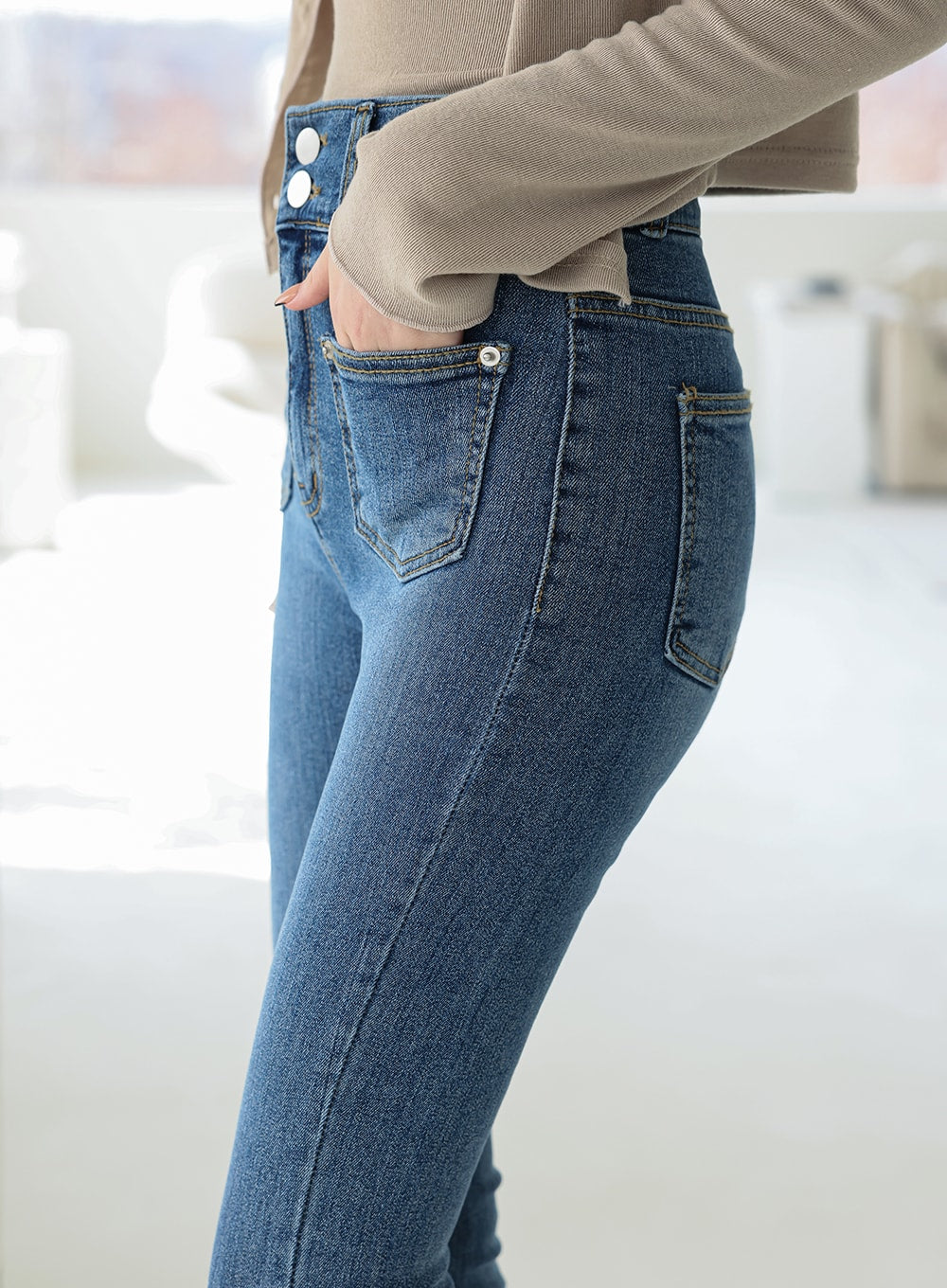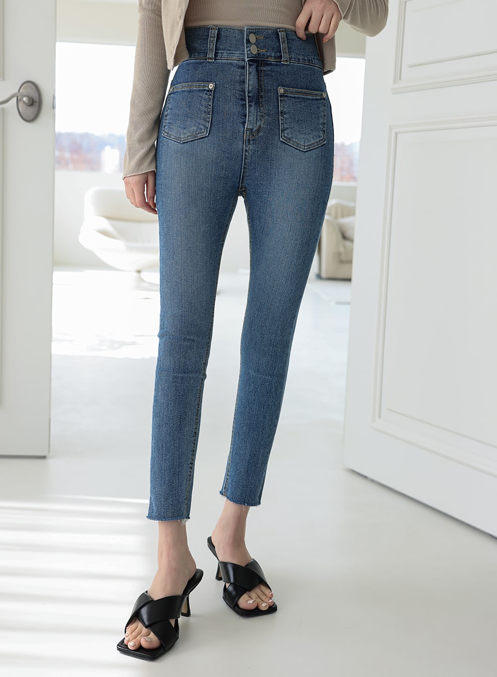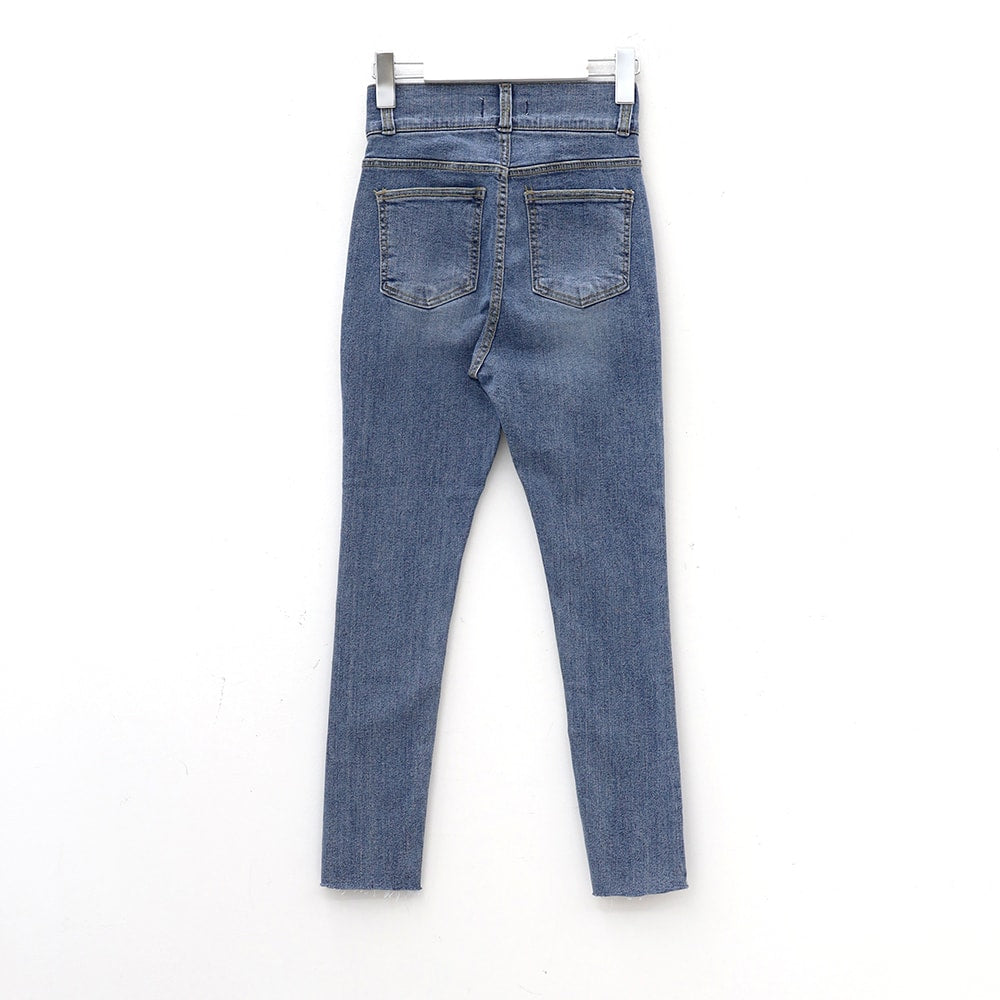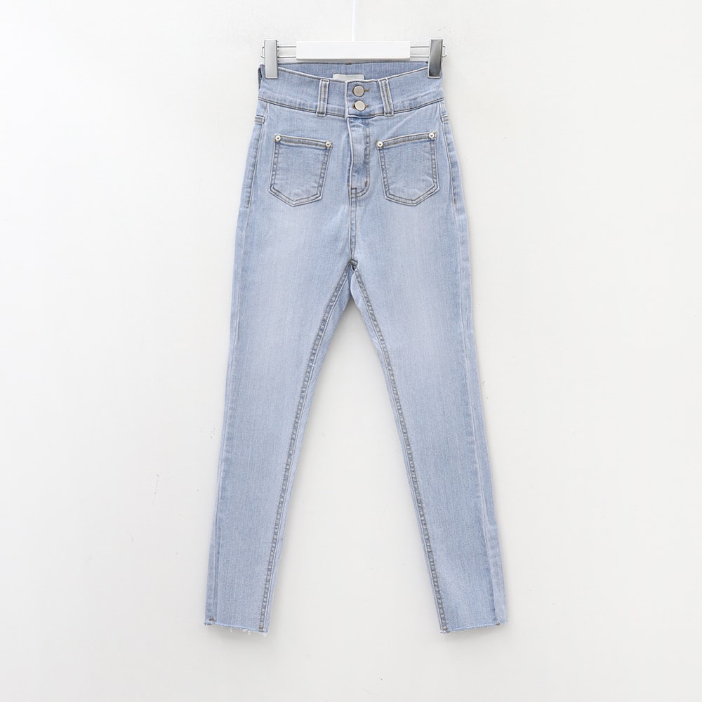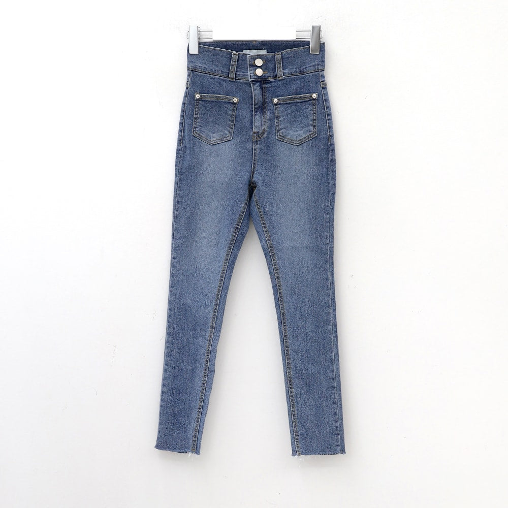 Double Button Raw Hem Skinny Jeans IA11