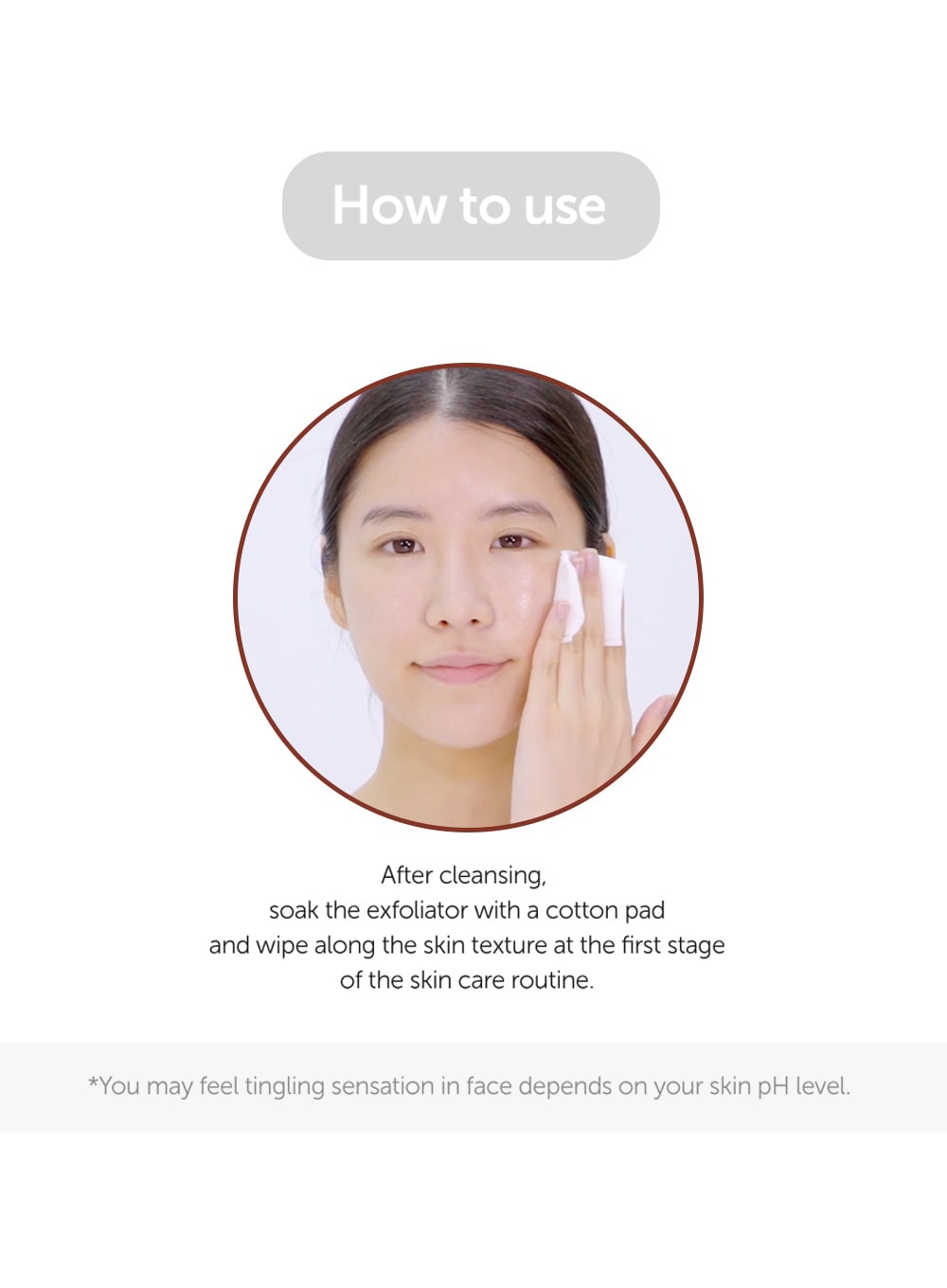 After cleansing, soak the exfoliator with a cotton pad and wipe along the skin texture at the first stage of the skin care routine.