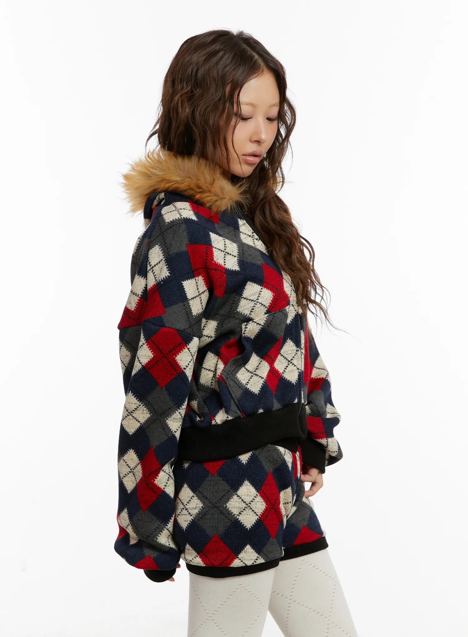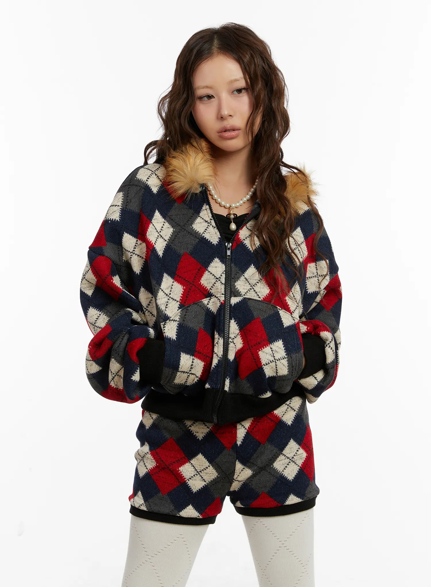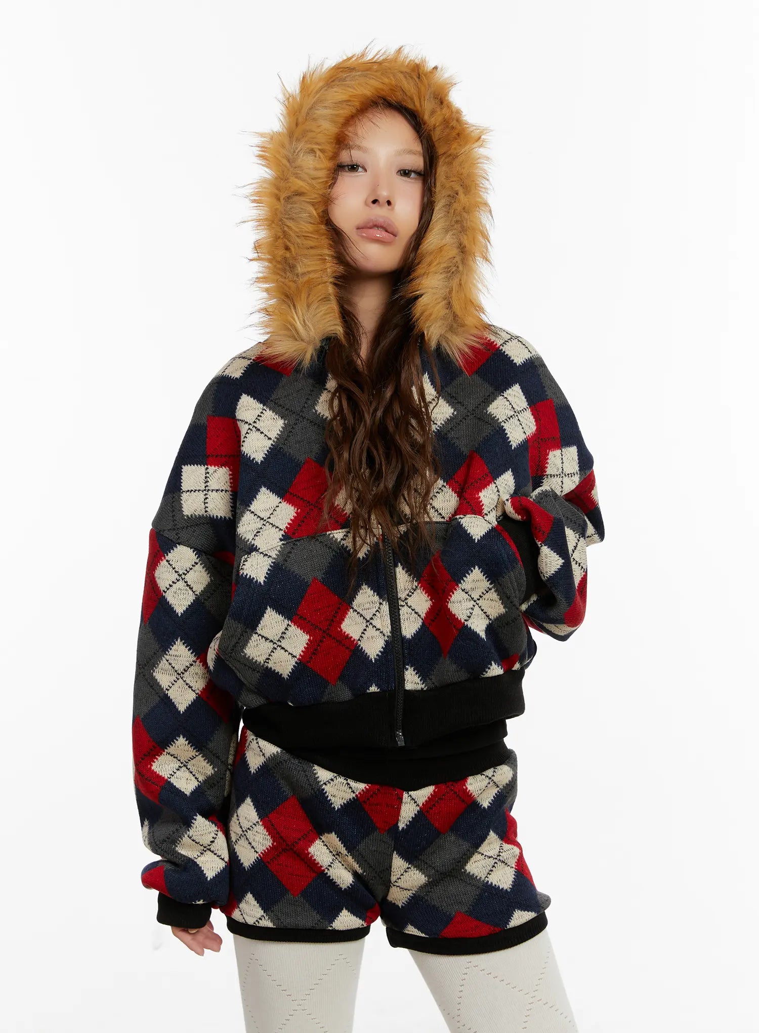 Argyle Faux Fur Trim Zip-Up Hoodie CD512