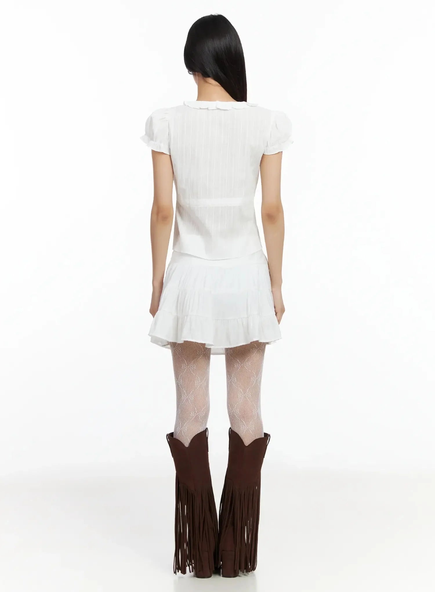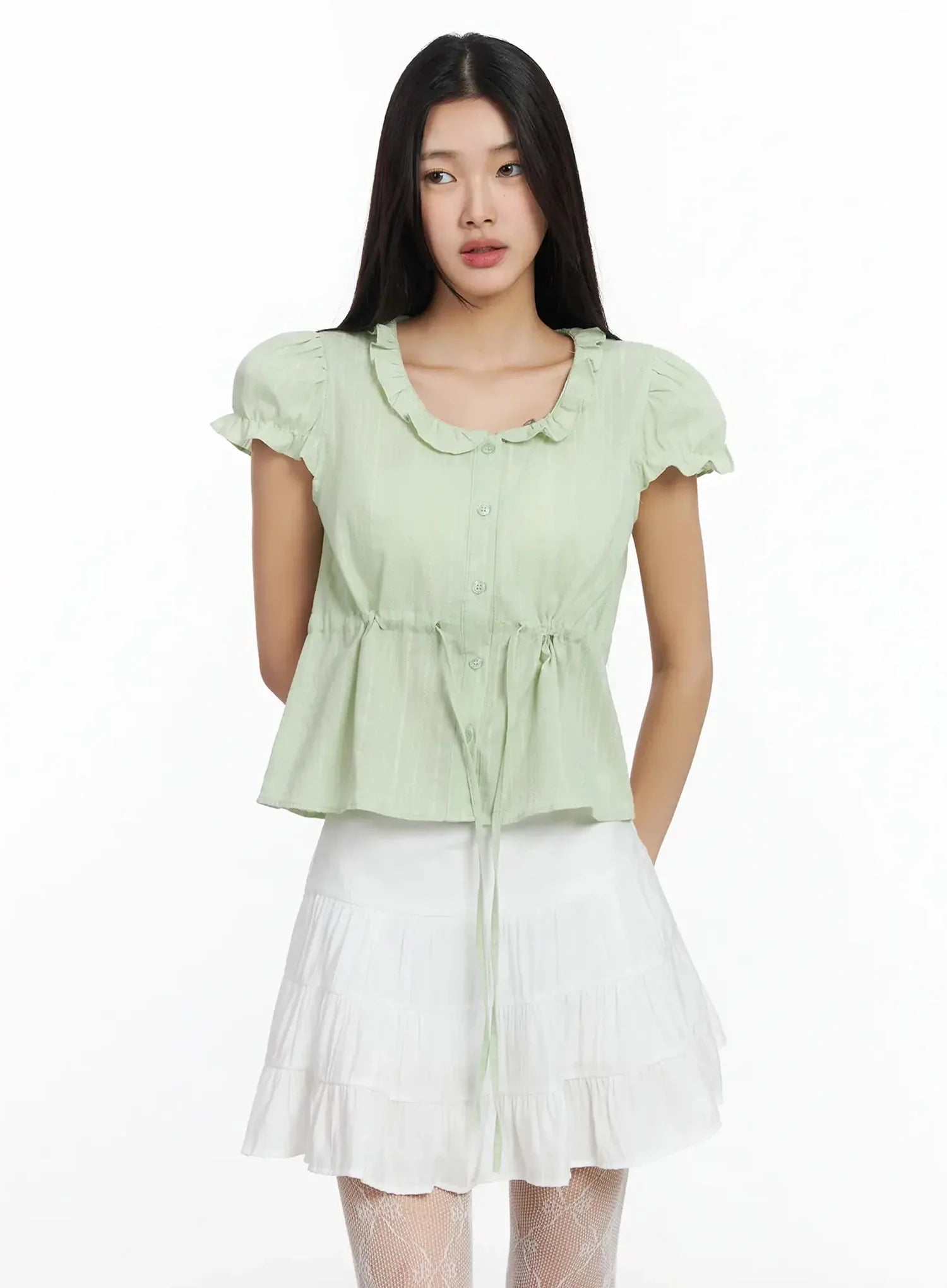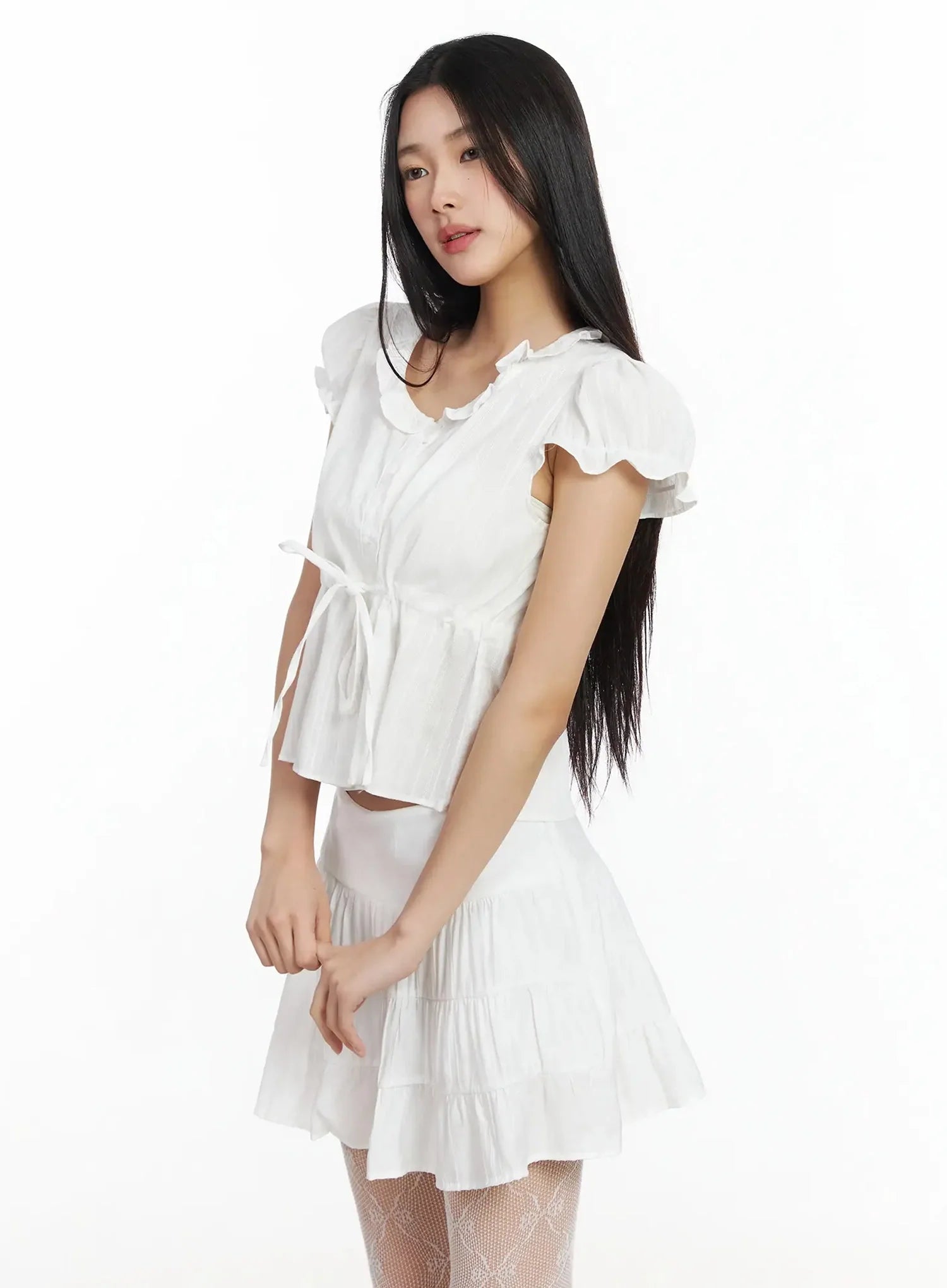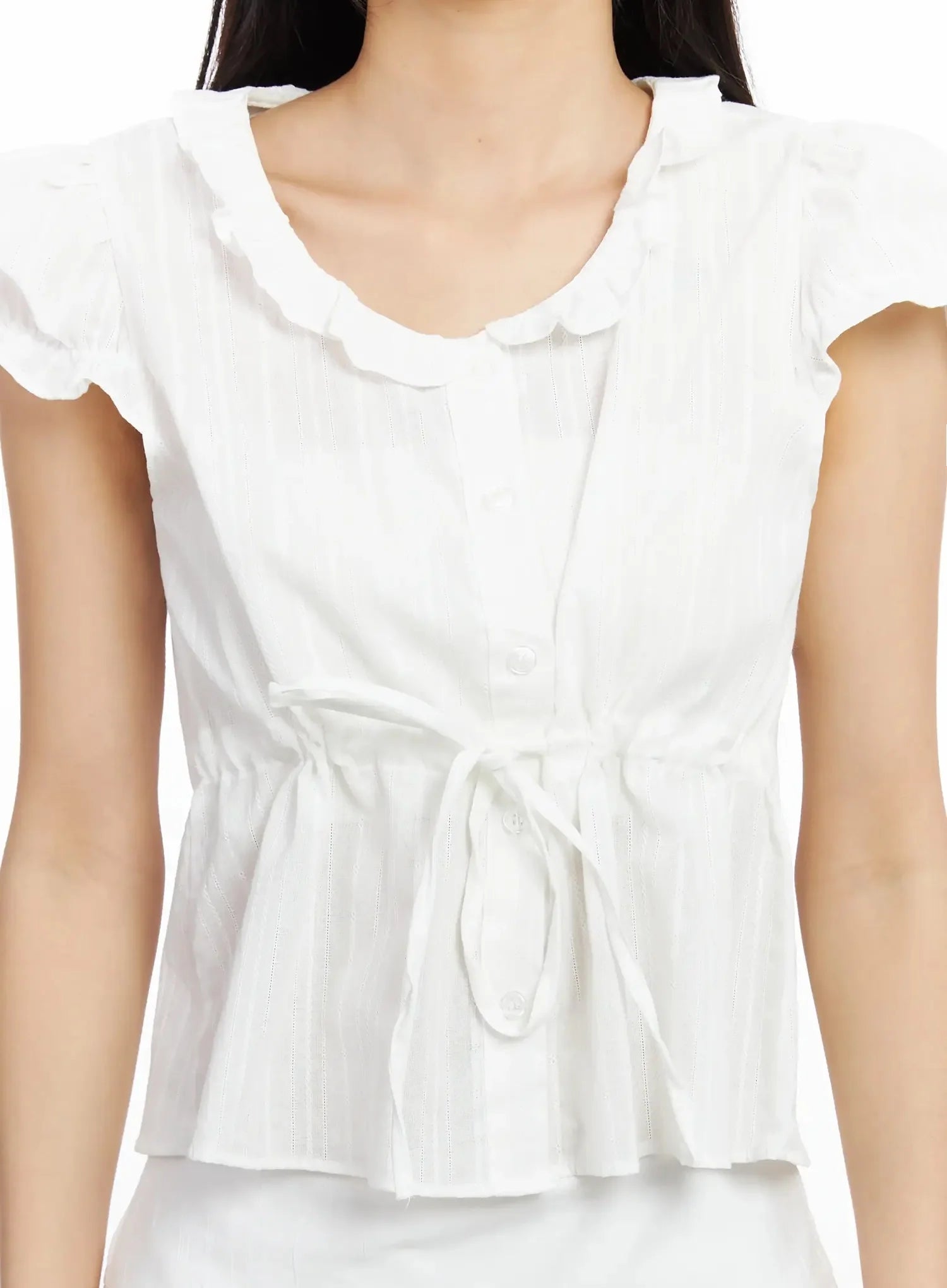 Ruffled Ribbon Tie Short Sleeve Blouse IM530