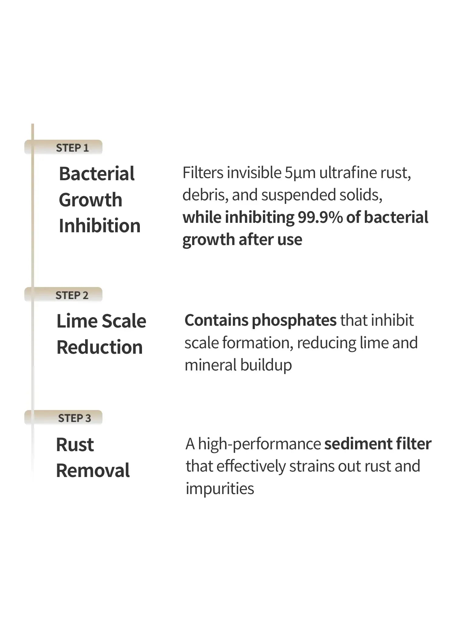 One filter for bacterial growth inhibition + impurity removal + rust filtration.