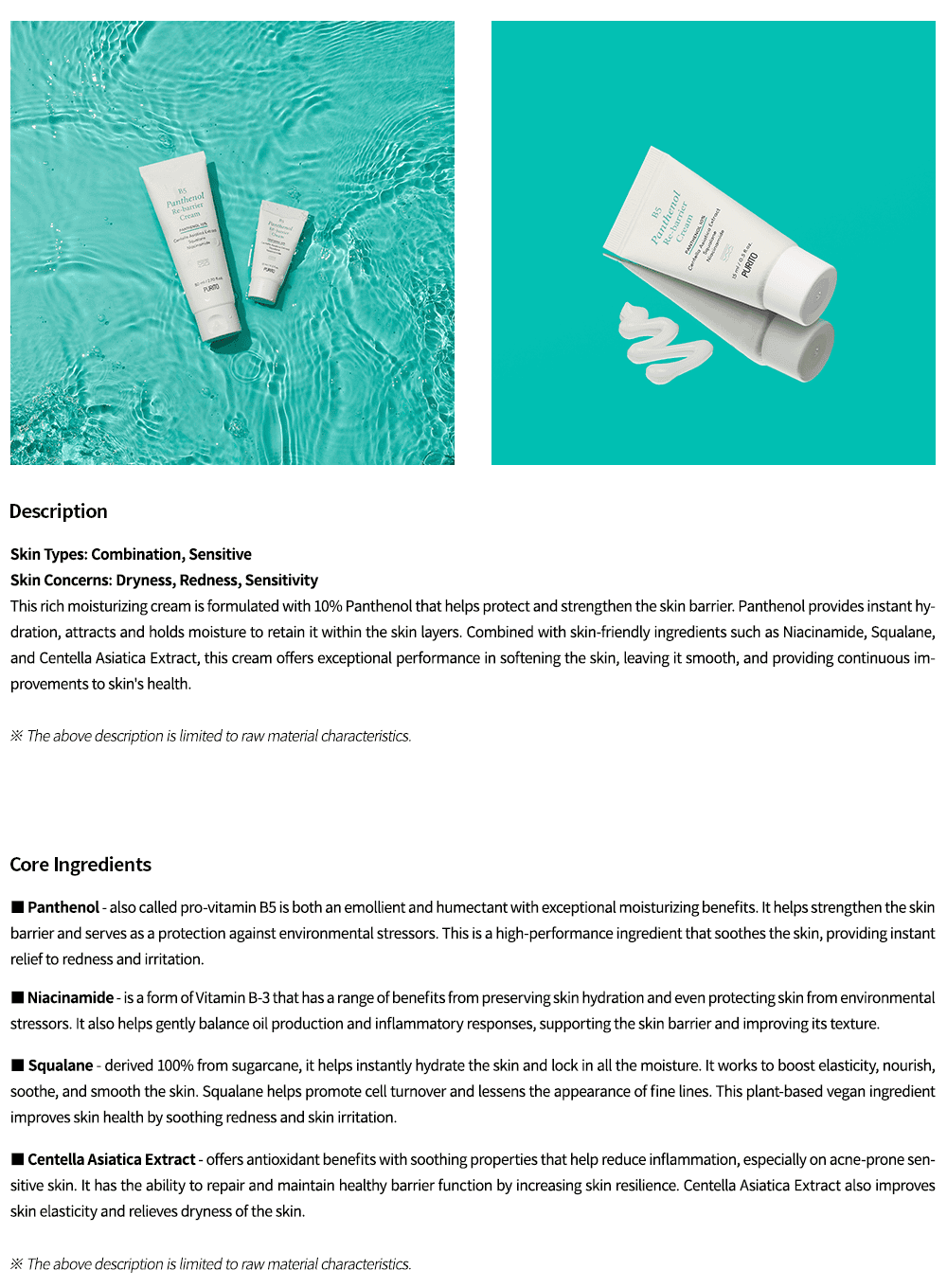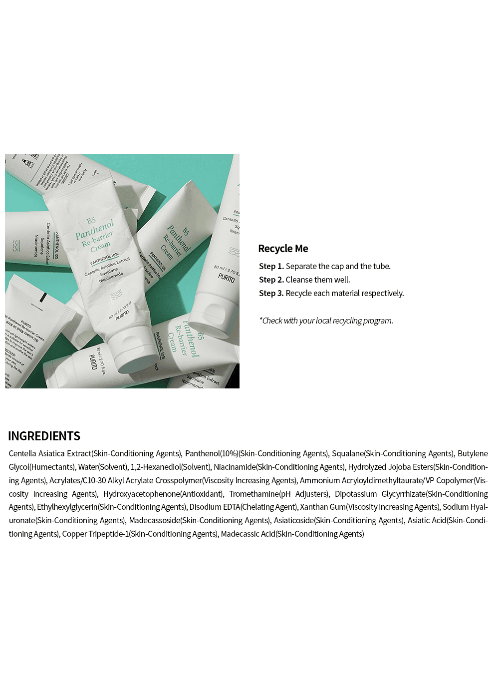 Centella Asiatica Extract, Panthenol(10%), Squalane, Butylene Glycol, Water, 1,2- Hexanediol, Niacinamide, Hydrolyzed Jojoba Esters, Acrylates/C10-30 Alkyl Acrylate Crosspolymer, Ammonium Acryloyldimethyltaurate/VP Copolymer, Hydroxyacetophenone, Tromethamine, Dipotassium Glycyrrhizate, Ethylhexylglycerin, Disodium EDTA, Xanthan Gum, Sodium Hyaluronate, Madecassoside, Asiaticoside, Asiatic Acid, Copper Tripeptide-1, Madecassic Acid