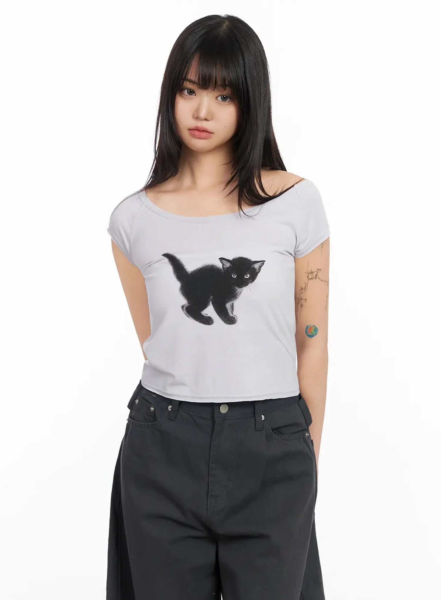 Cat Graphic Off-Shoulder Crop Top IA523