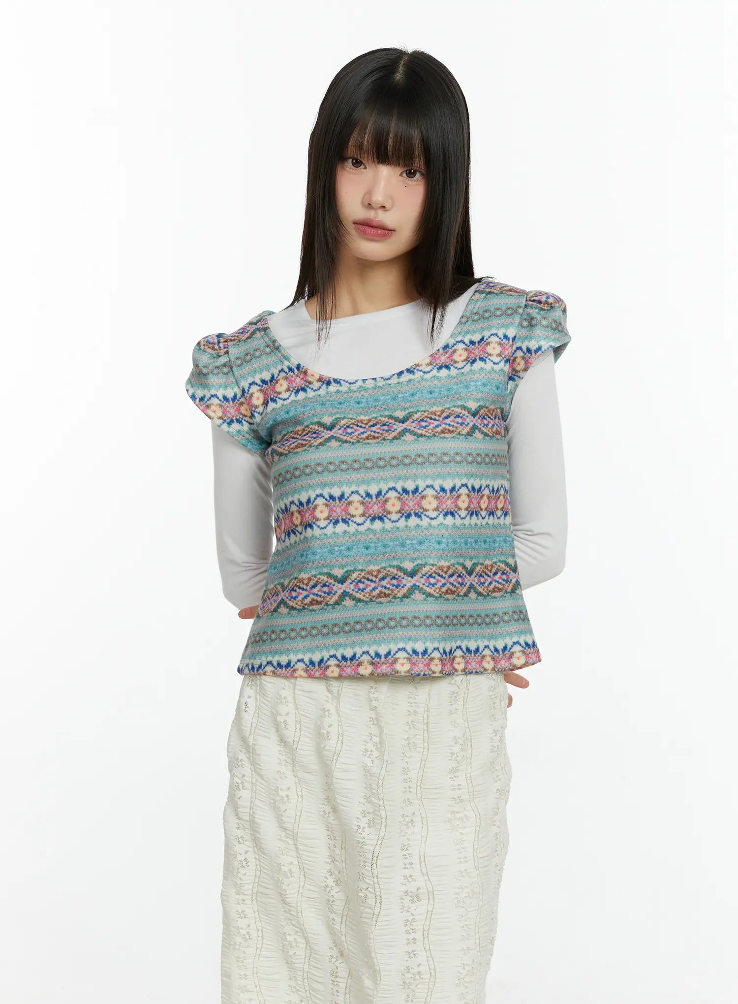 Fair Isle Puff Short Sleeve Top CF509