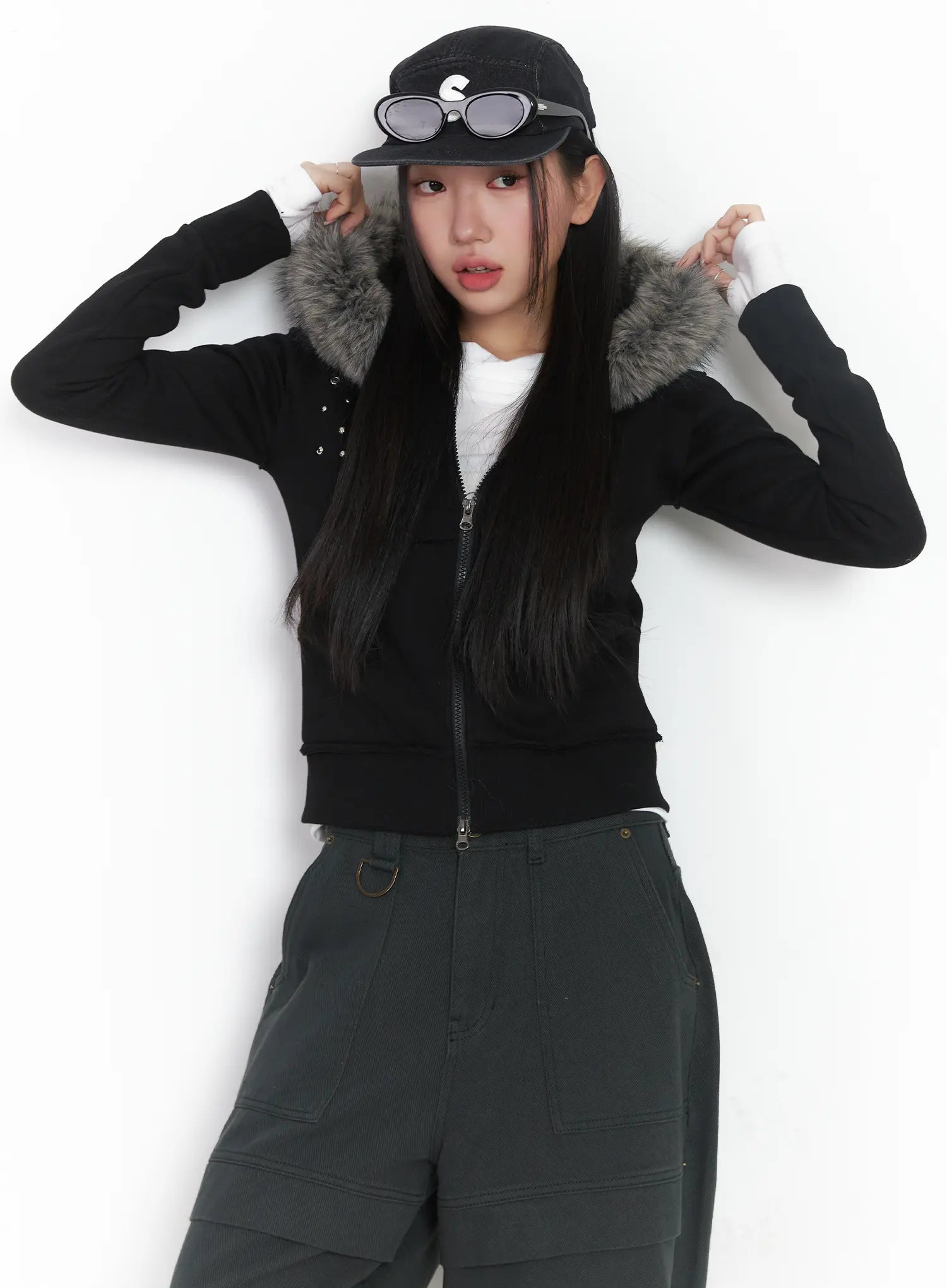 Faux Fur Fleece Eyelet Crop Hoodie CJ514
