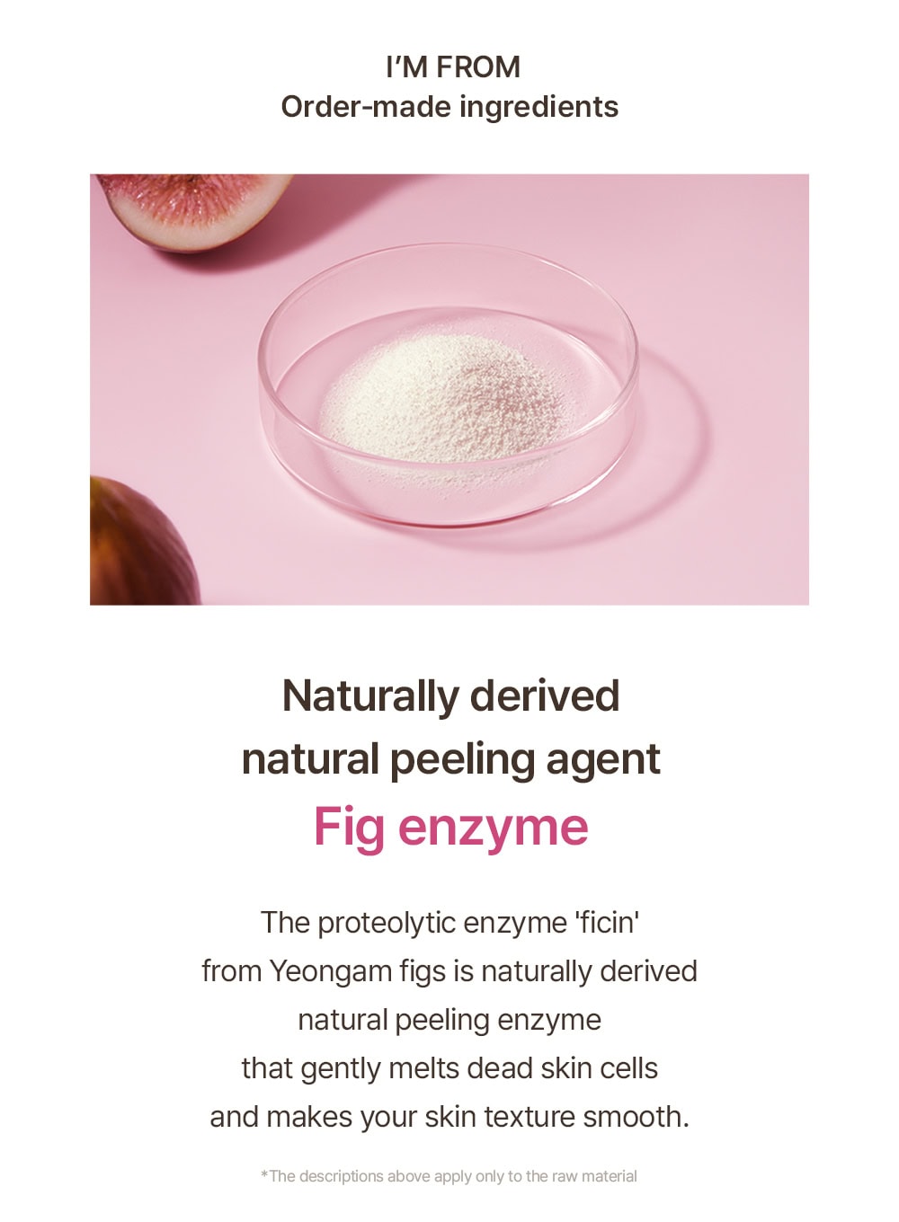 Zea Mays (Corn) Starch, Sodium Cocoyl Isethionate, Sodium Lauroyl Glutamate, Hydrolyzed Hyaluronic Acid, Ficus Carica (Fig) Fruit Water, Aspergillus Ferment, Triticum Aestivum (Wheat) Seed Extract, Ficus Carica (Fig) Fruit Extract, Sodium Myristoyl Glutamate, Allantoin, Papain, Glycerin, Mandelic Acid, Maltodextrin, Water, 1,2-Hexanediol, Lipase, Protease, Ficin, Fragrance(Parfum)