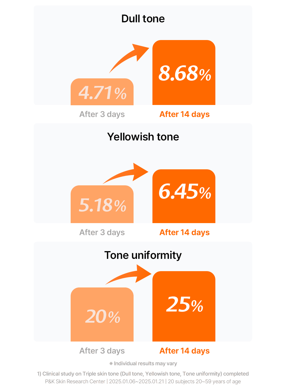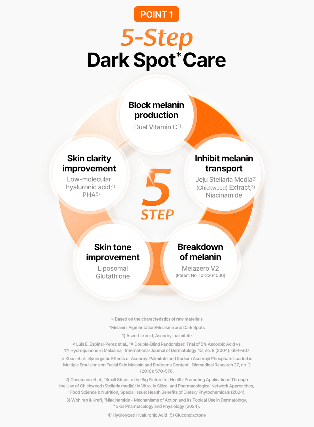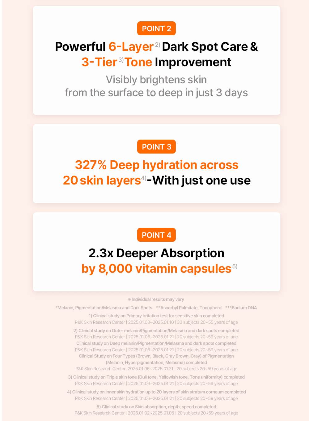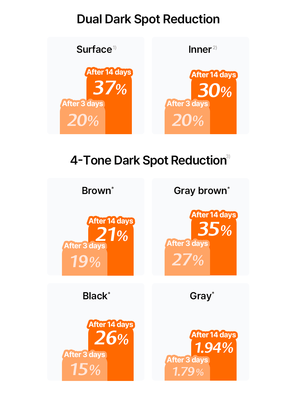 - Clinically shown to improve dark spots in 6 layers and skin tone in 3 steps—visible results in just 3 days.