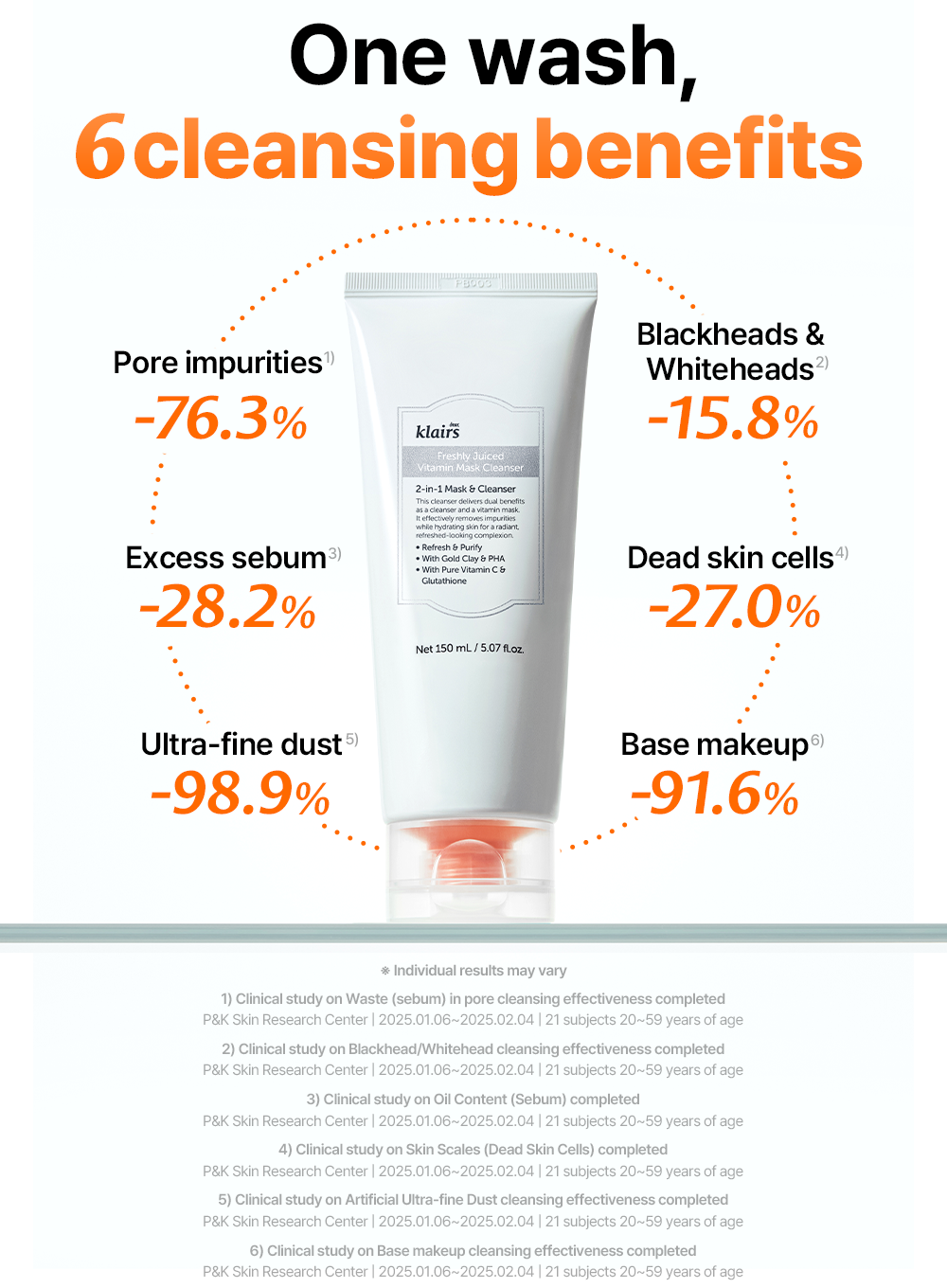 A gentle 6-in-1 cleanser mask infused with Vitamin C and Glutathione for radiant, hydrated skin.