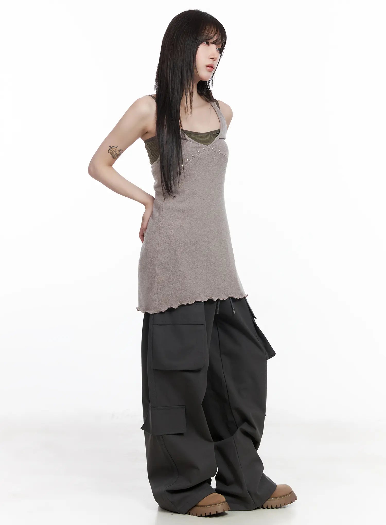Model is wearing size S/M and the color Beige.