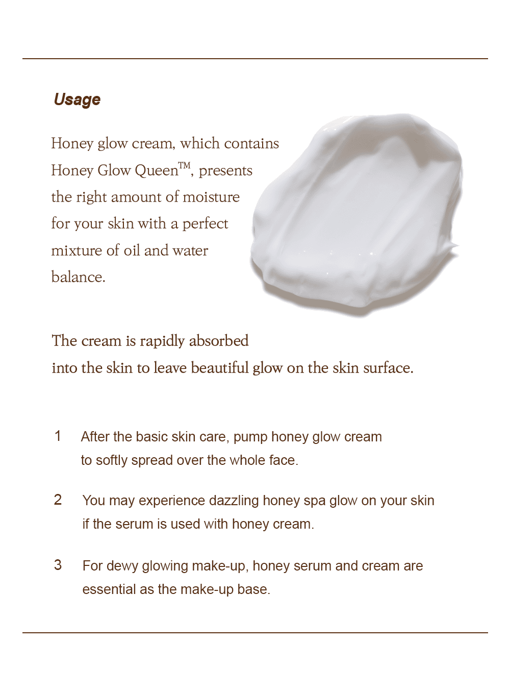 - This cream contains 30.63% of Honey Glow Queen (Honey Complex)