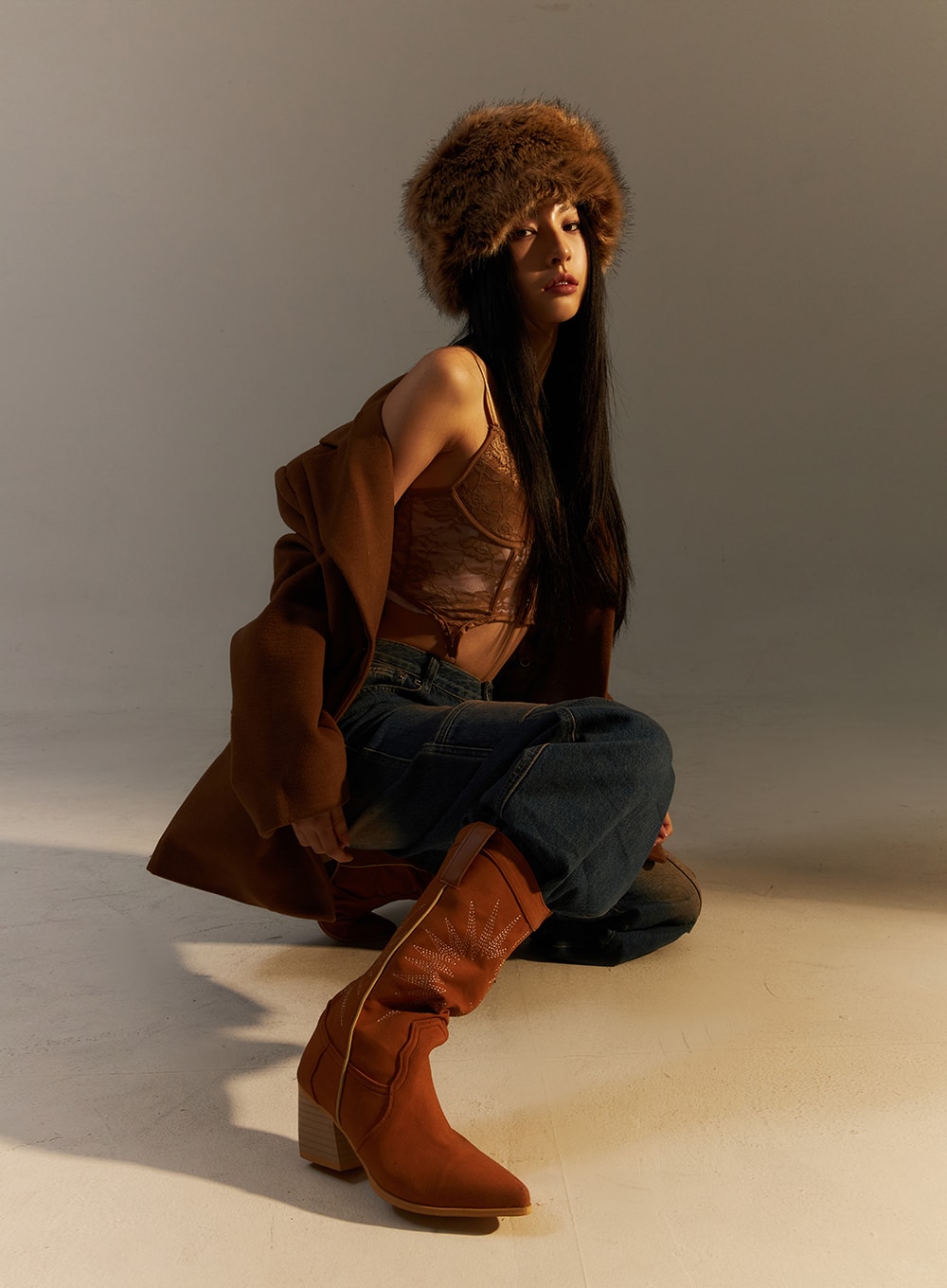 Model is wearing size S/M and the color Beige.
