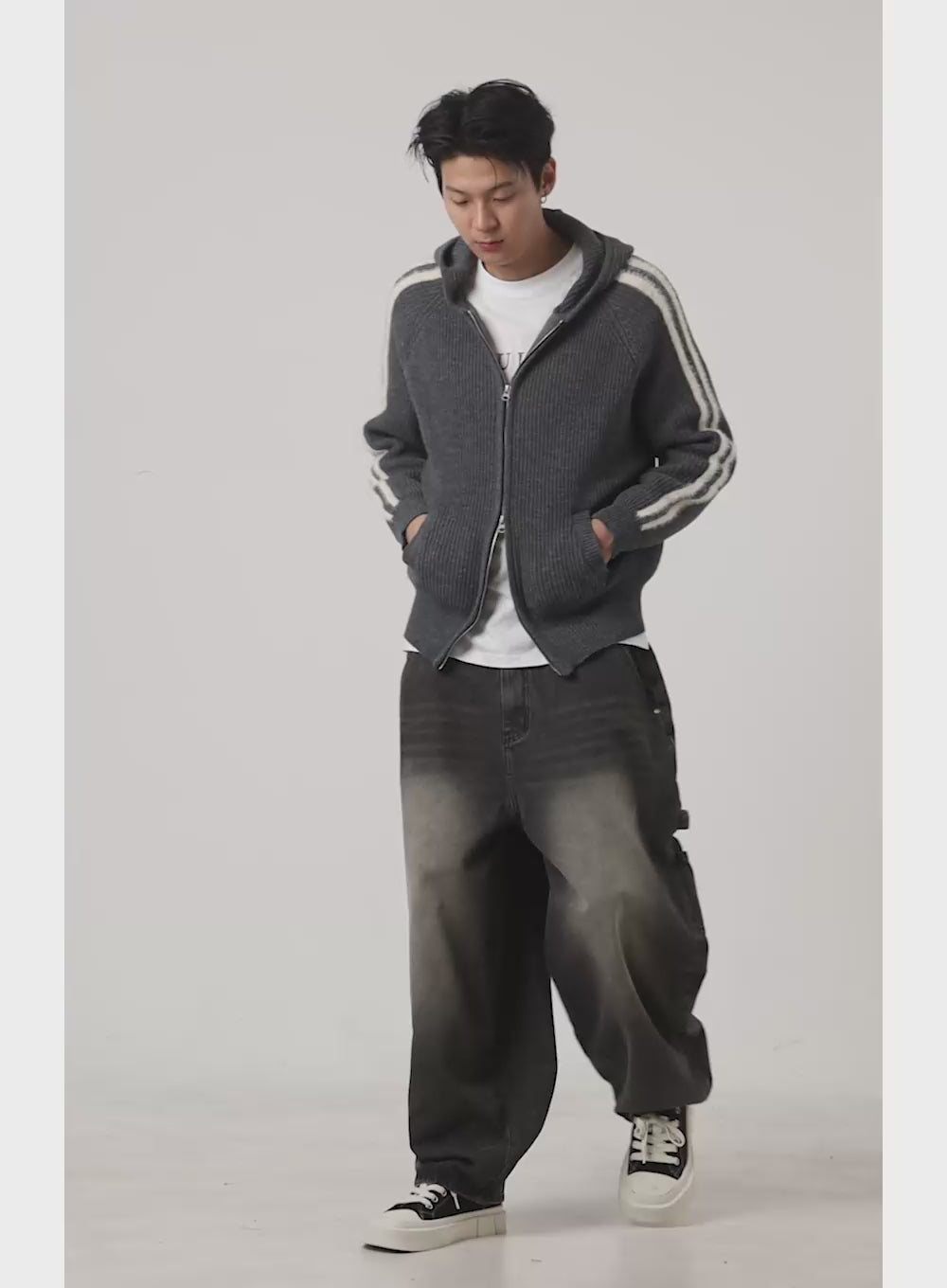 Men's Striped Double Zipper Knit Hoodie IO428