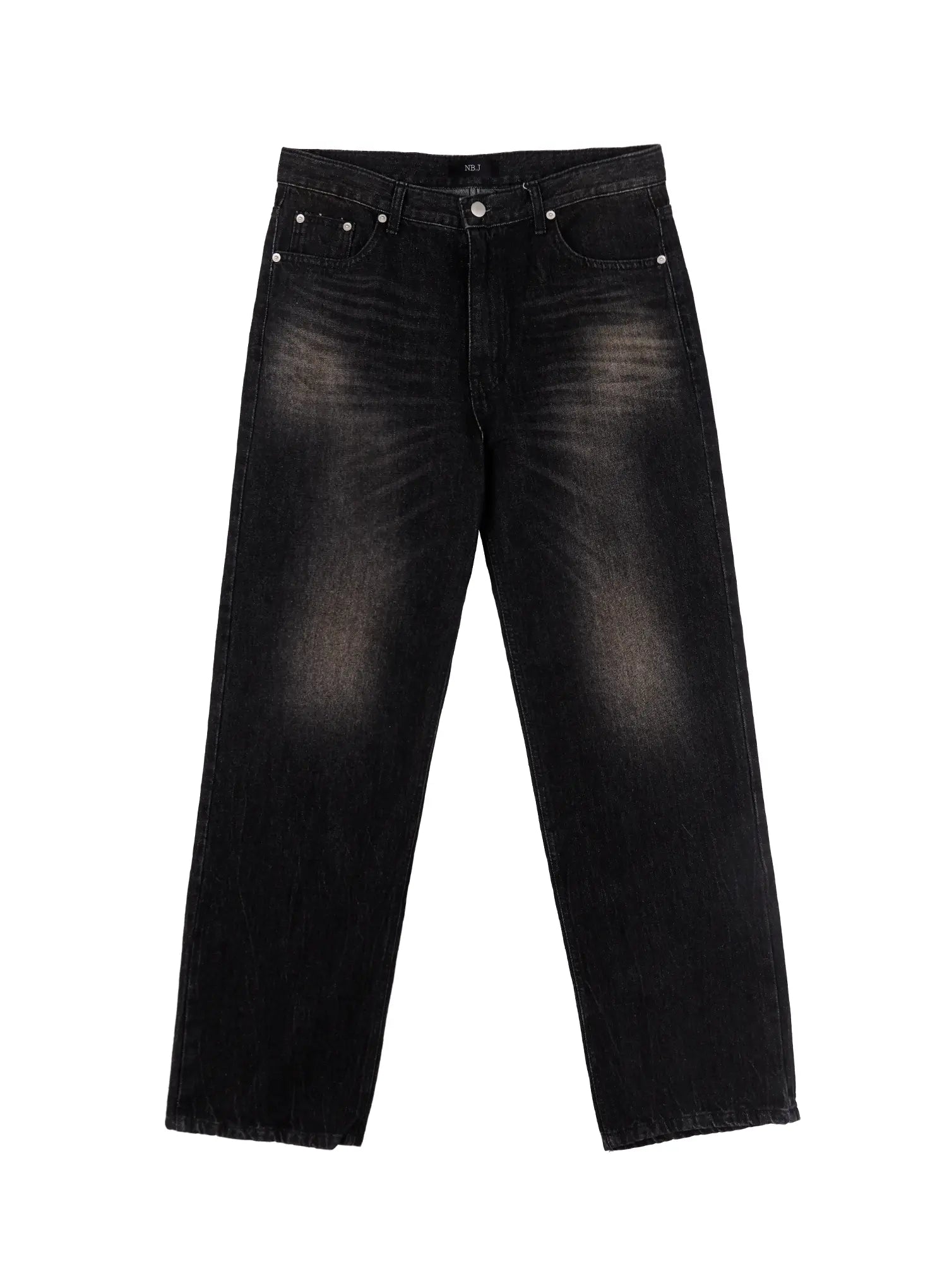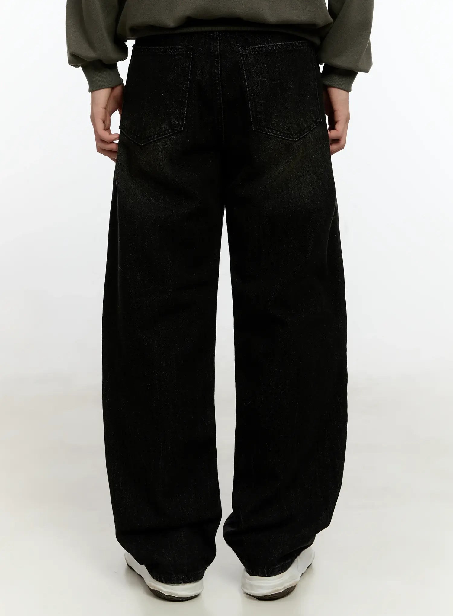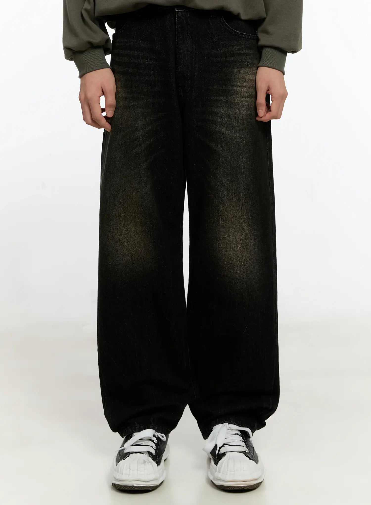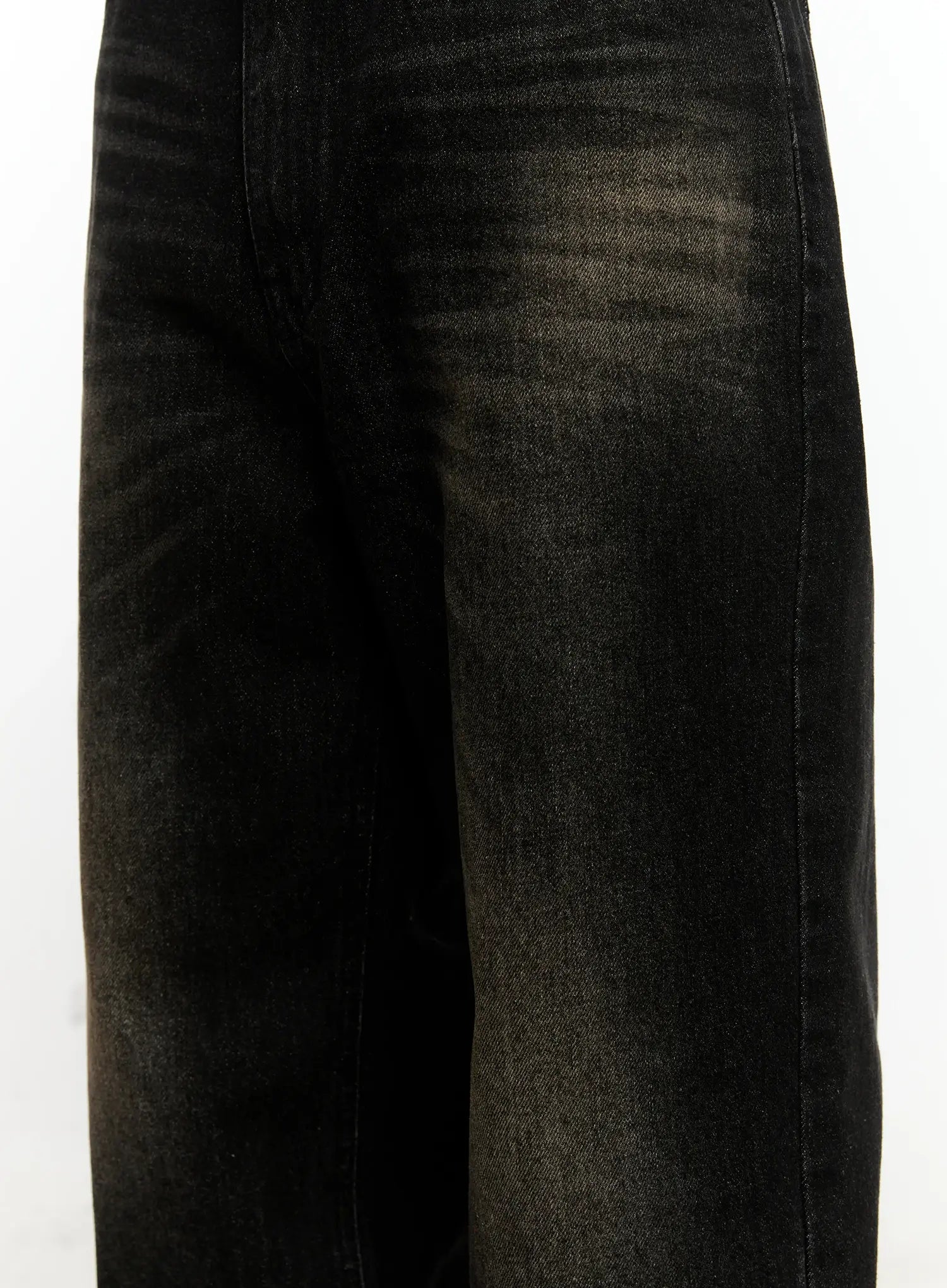 Men's Wide-Leg Washed Black Denim Jeans IO531