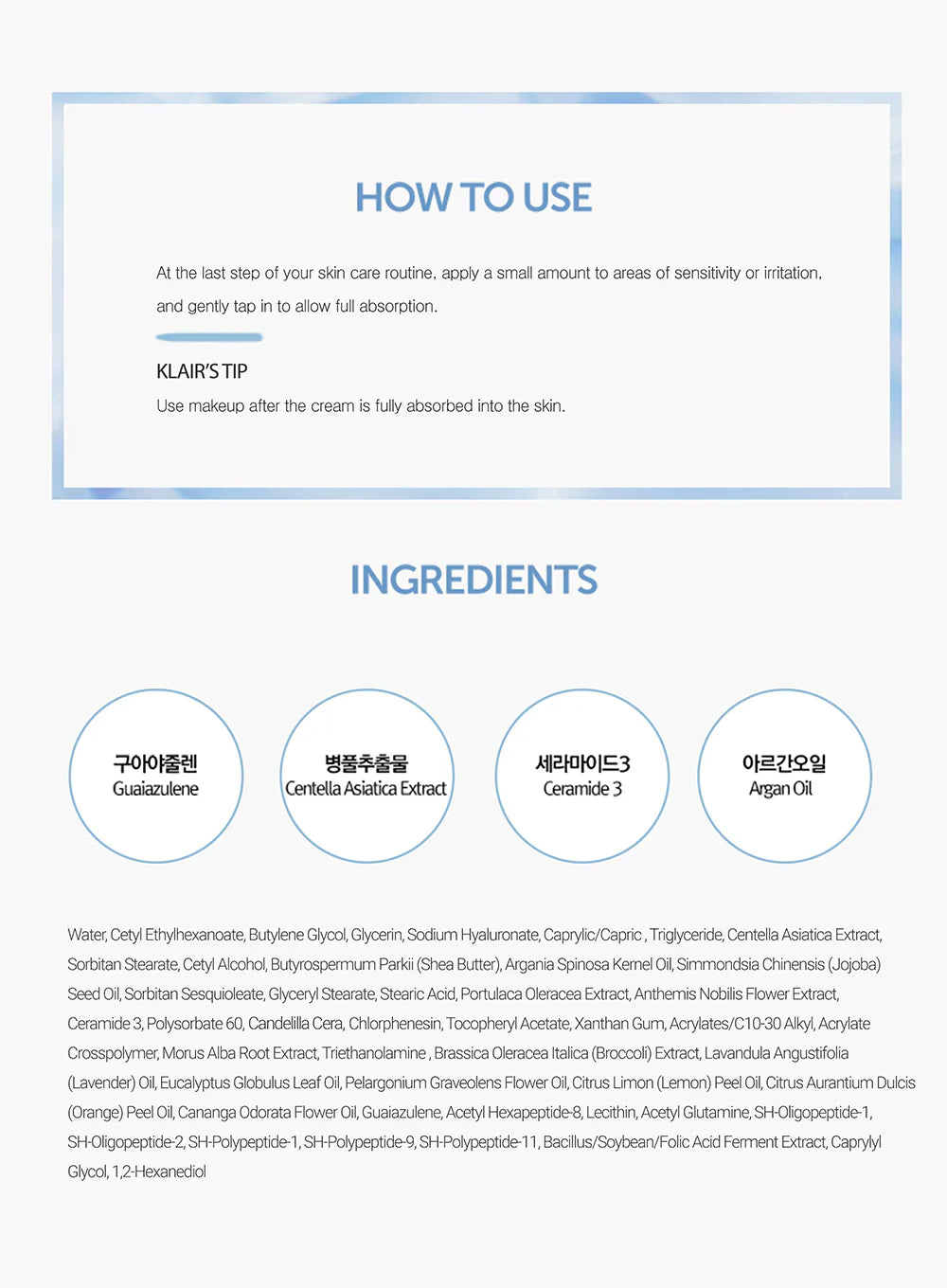 Centella Asiatica Extract, Sorbitan Stearate, Cetyl Alcohol, Butyrospermum Parkii (Shea Butter), Argania Spinosa Kernel Oil,