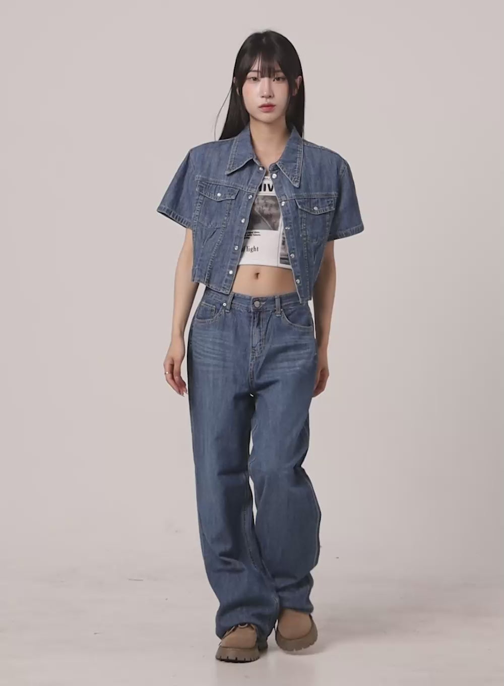 Pocketed Washed Denim Crop Shirt CY407