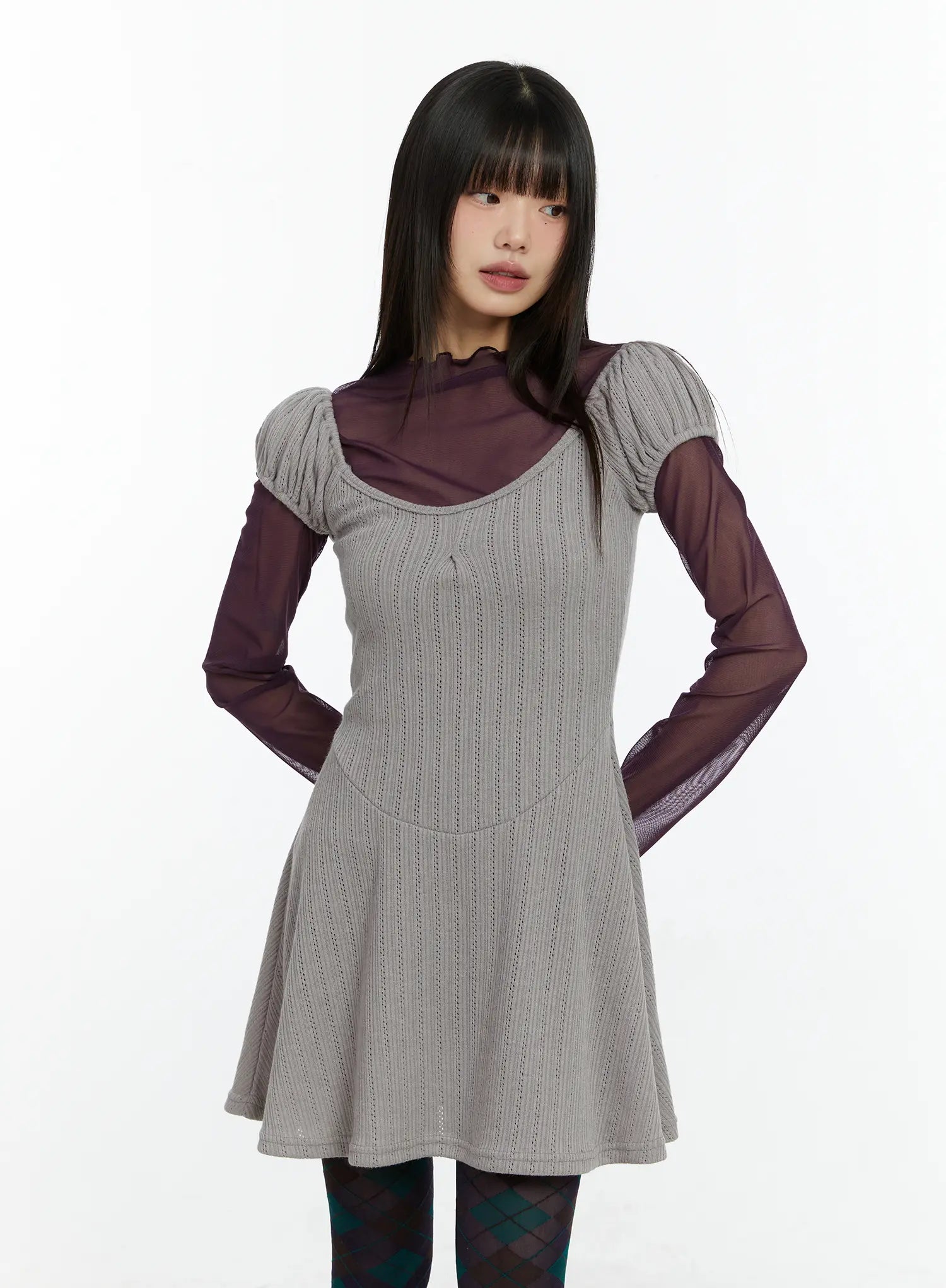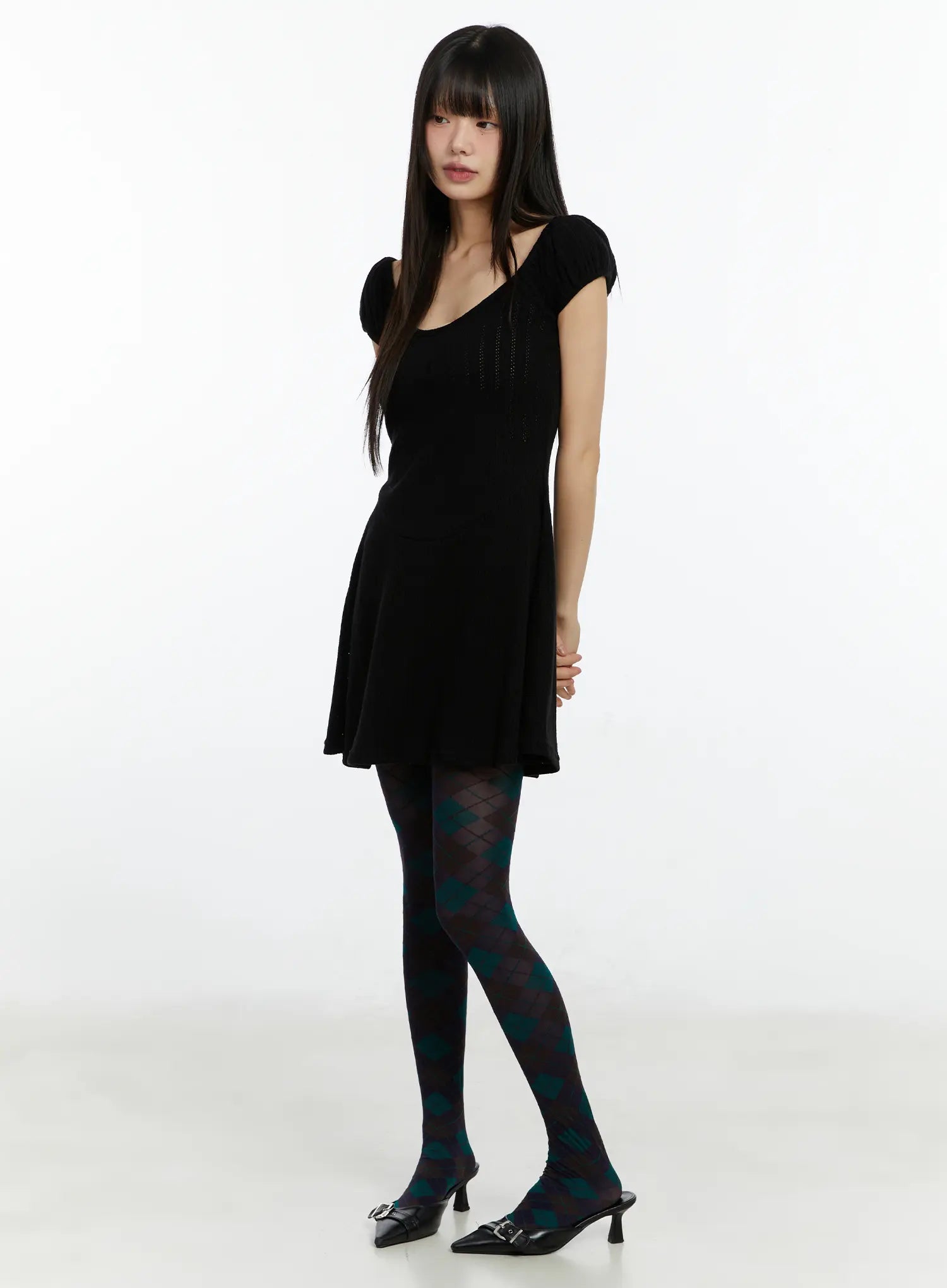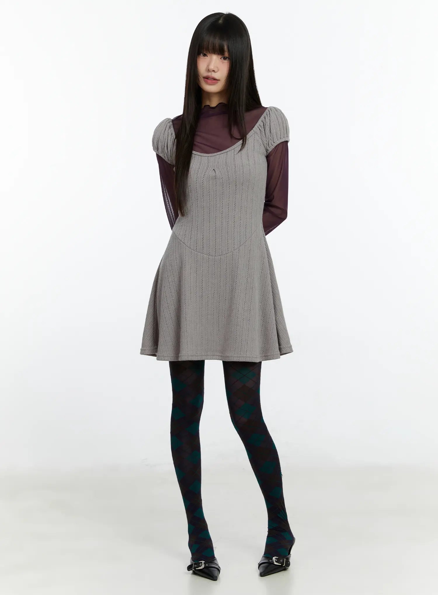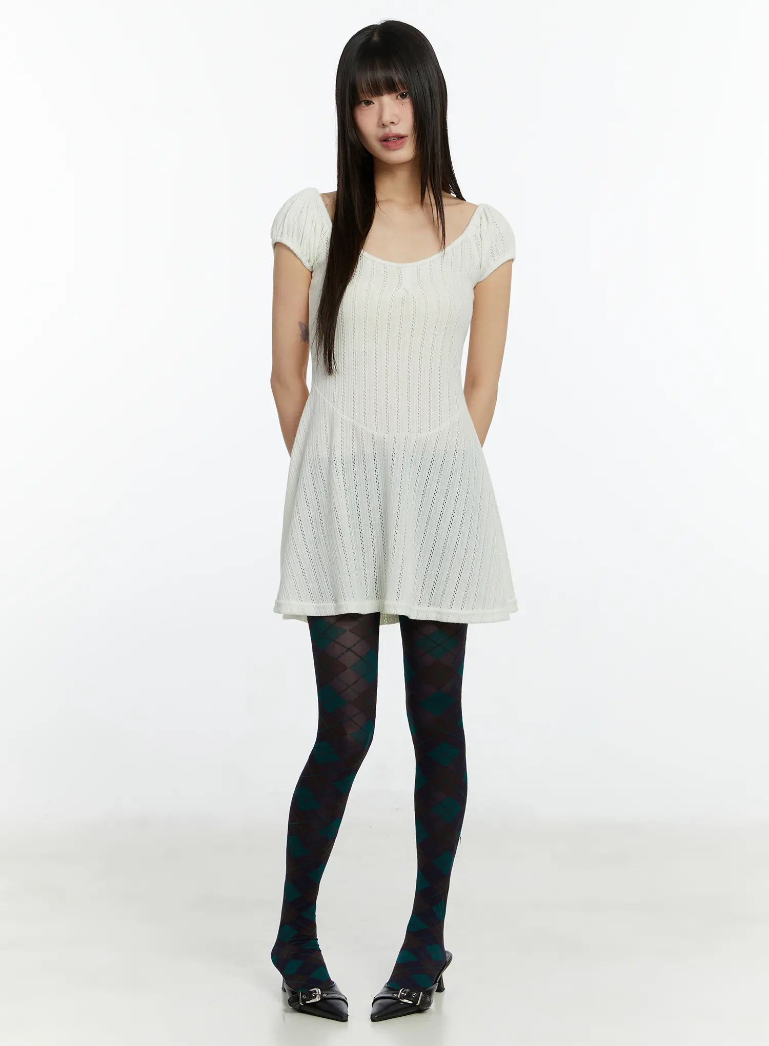 Pointelle Puff Sleeve Flare Mini Dress CF509
