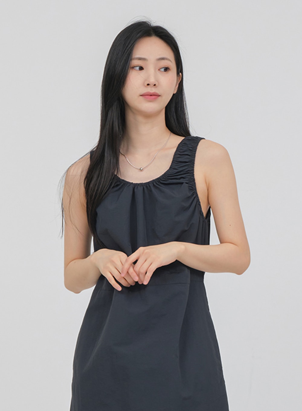 Round Neck Shirring Nylon Maxi Dress OA14
