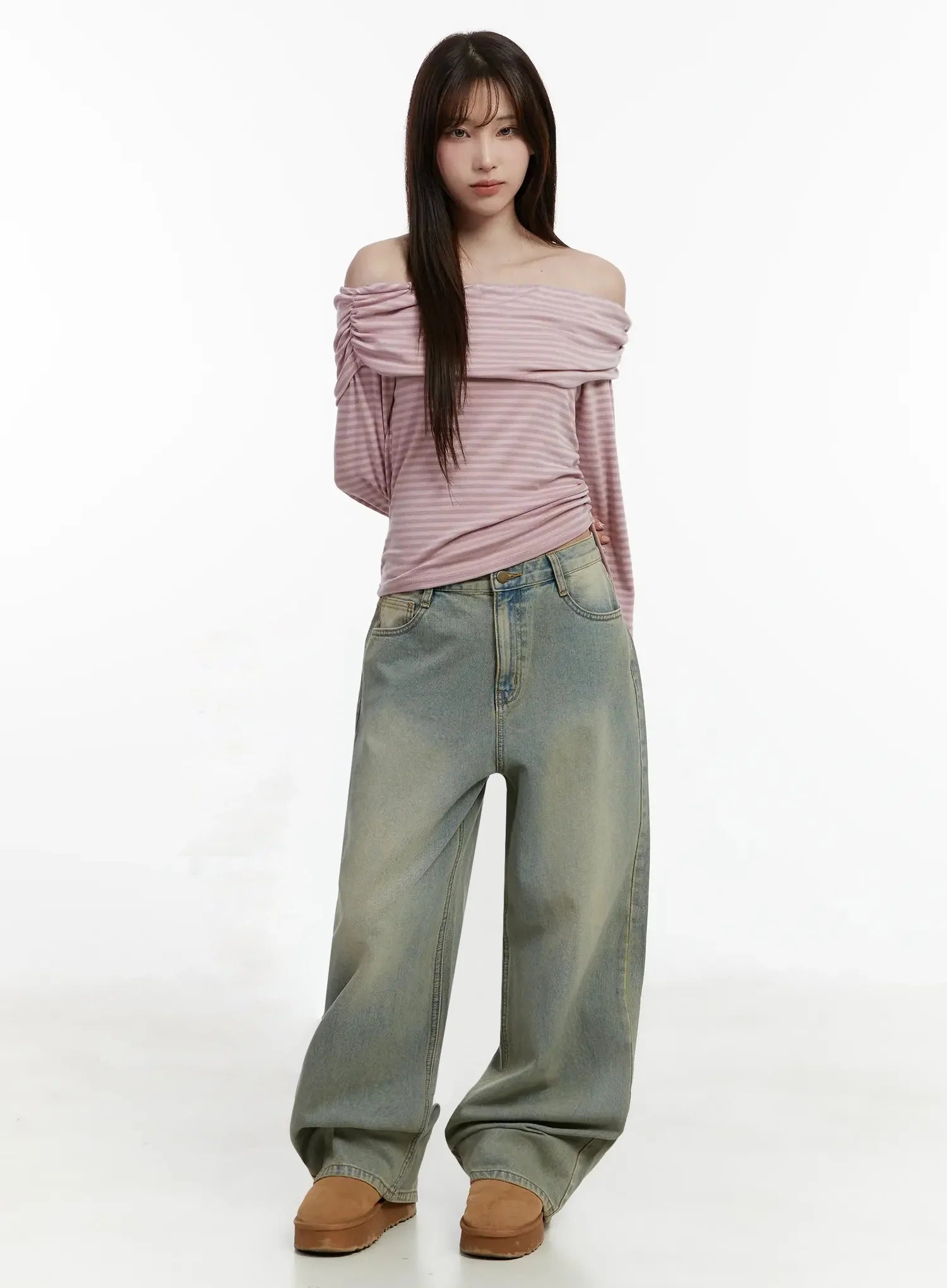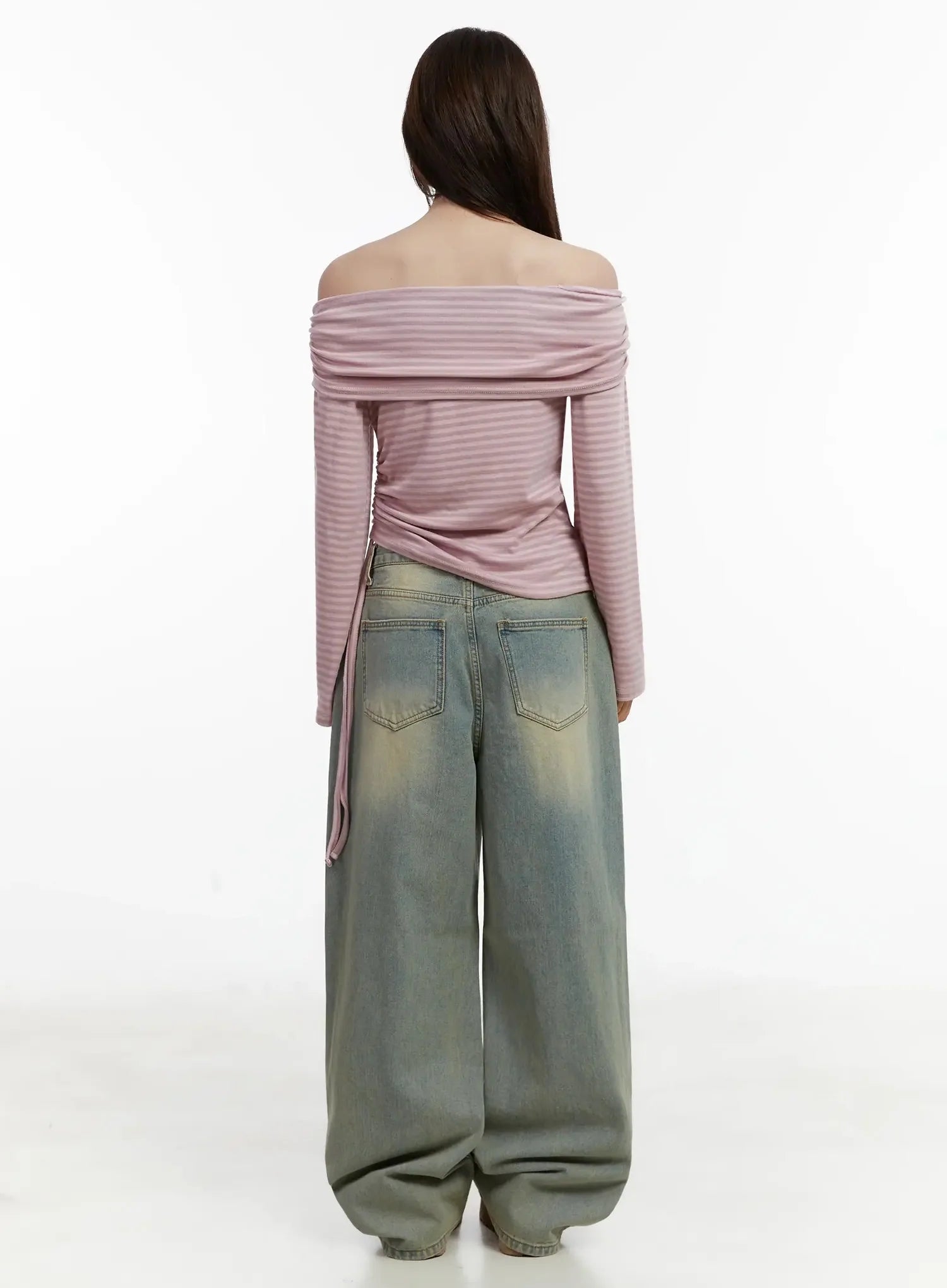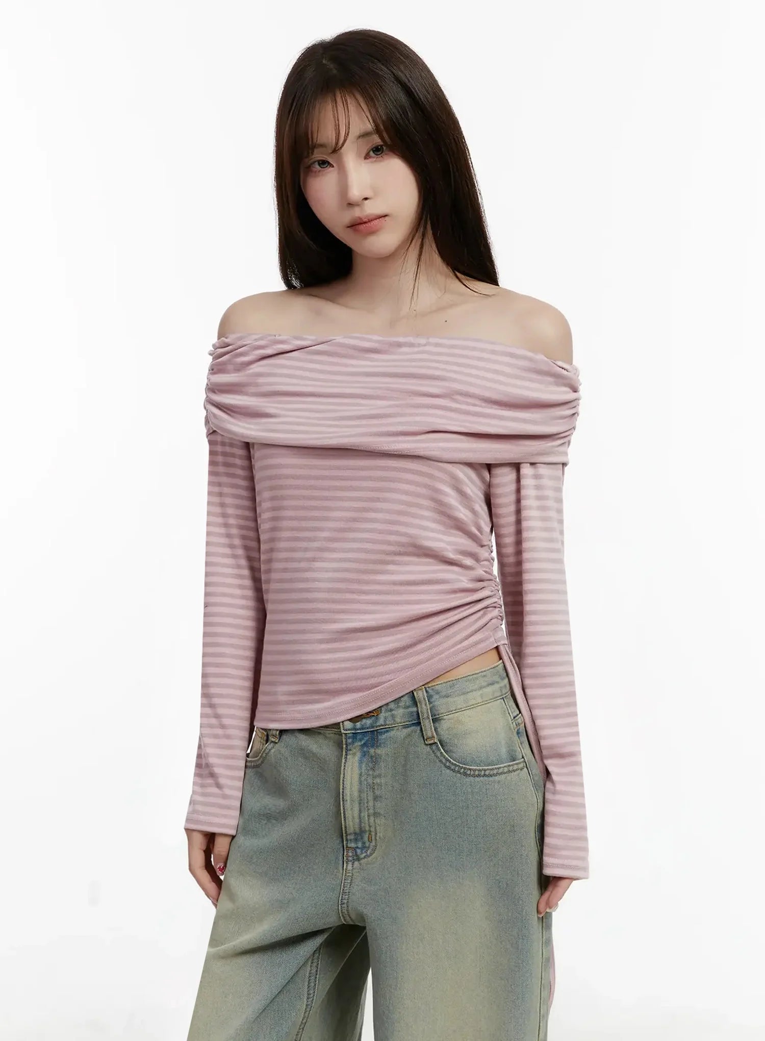 Striped Off-Shoulder Shirred Top IJ516
