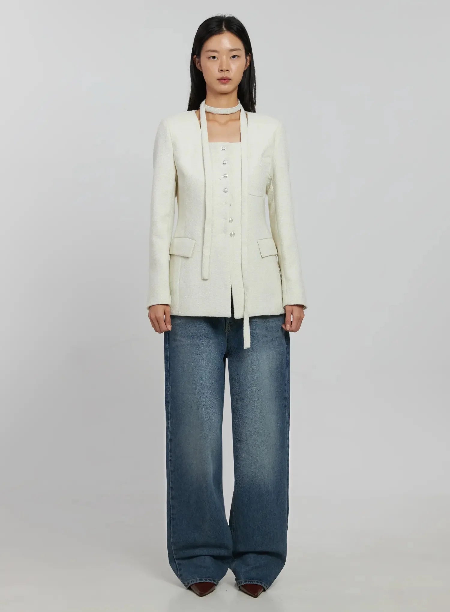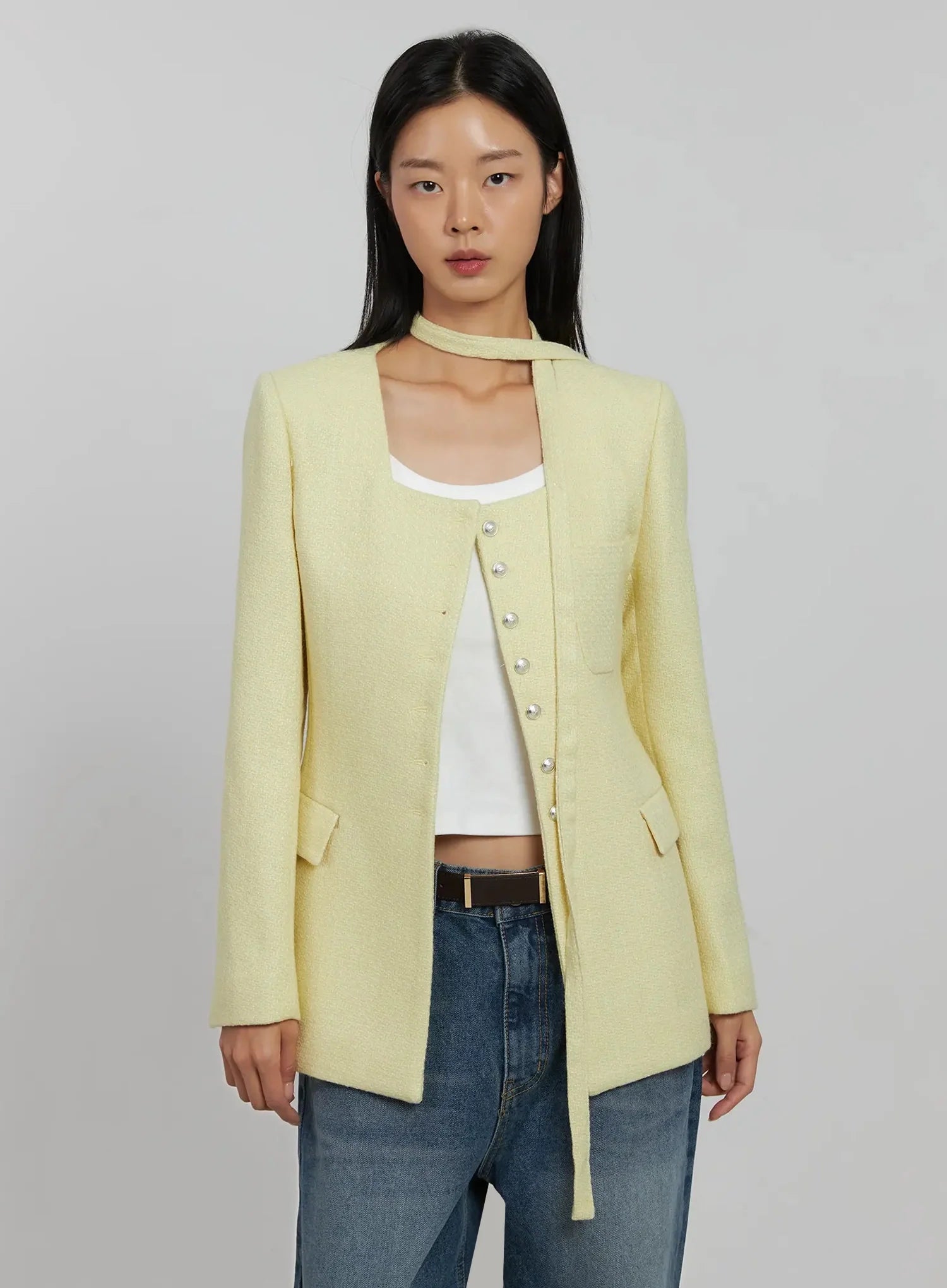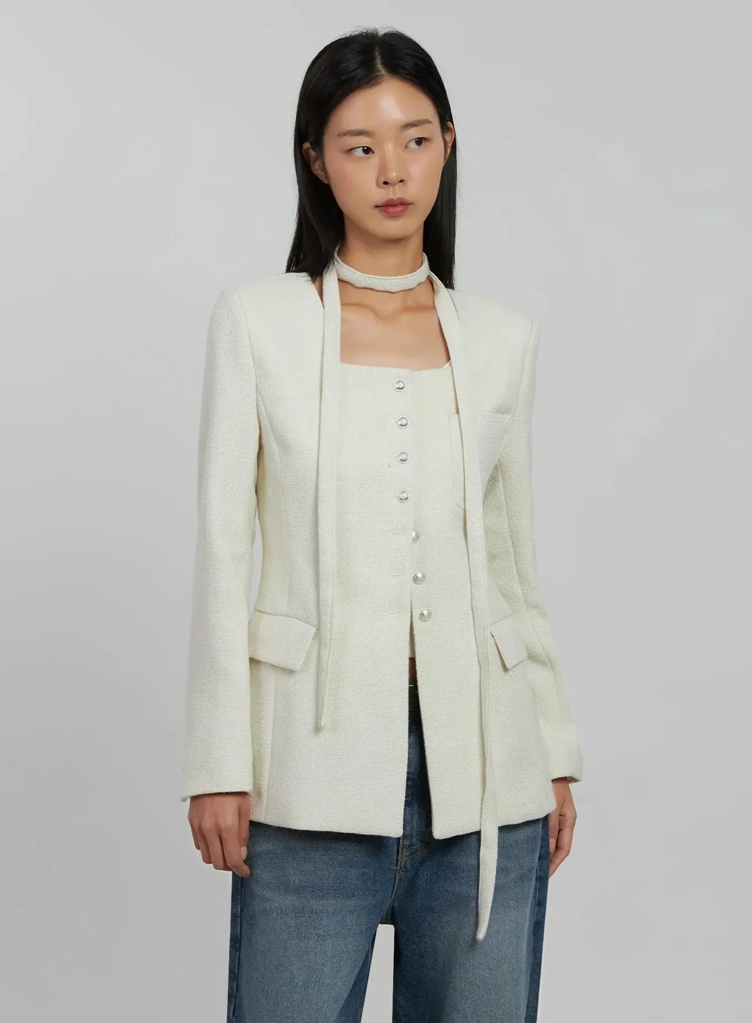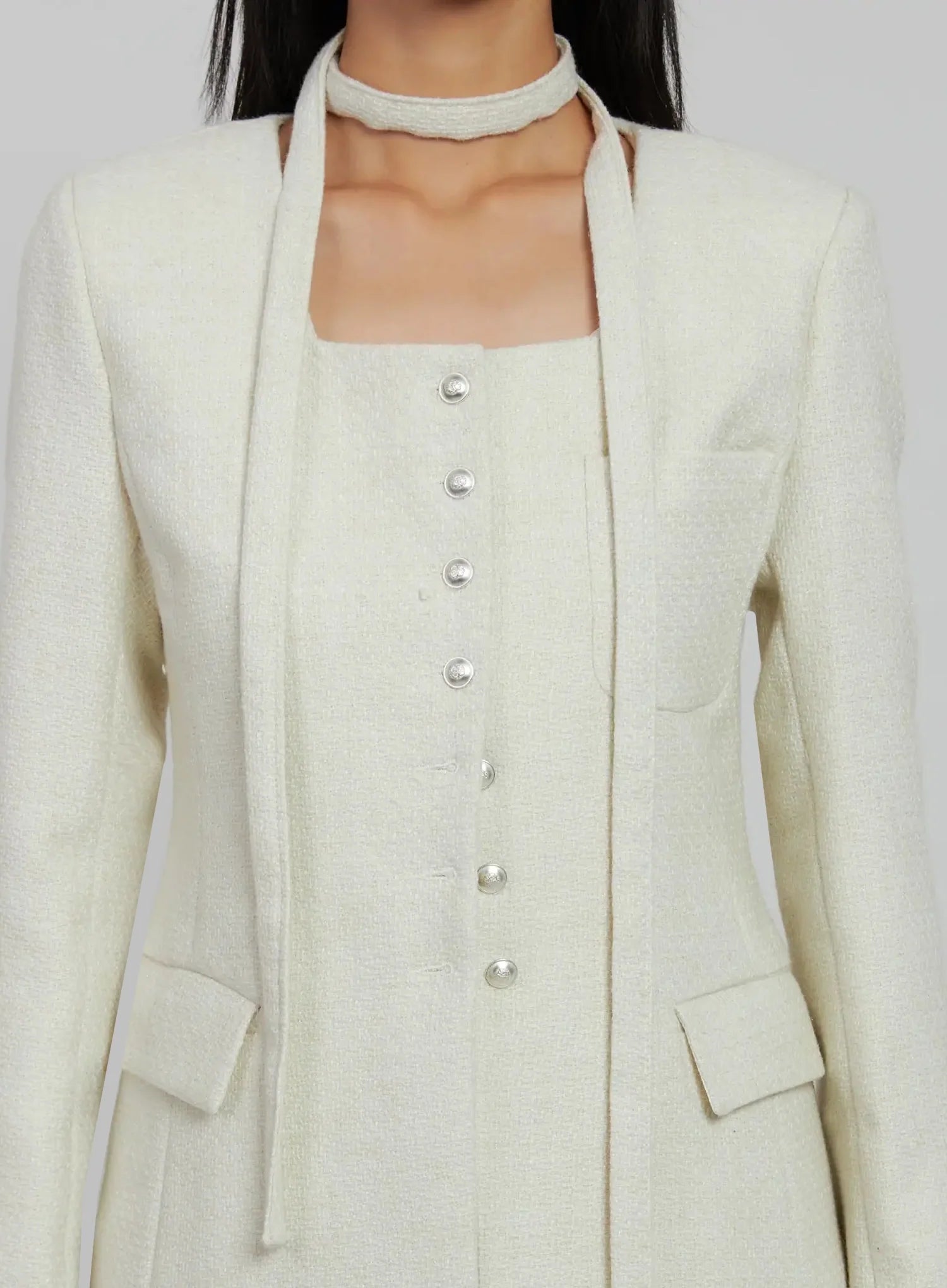 Tweed Square Neck Jacket Scarf Set IJ508