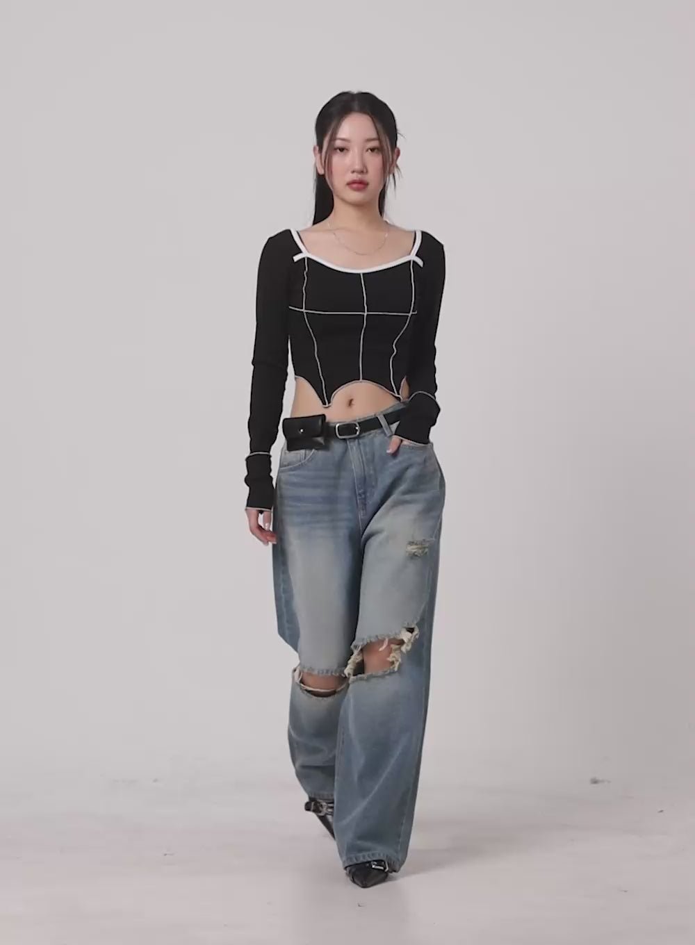 U Neck Stitched Detail Cropped Long Sleeve CA416